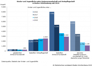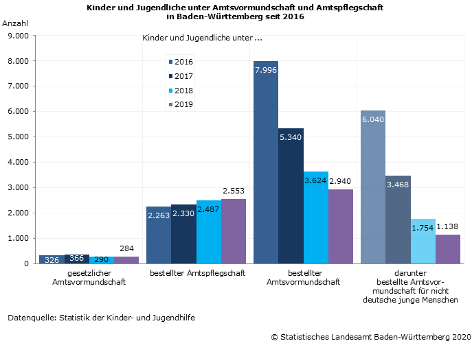 Beim Tod beider Eltern, aber auch bei einem vollständigen Entzug der elterlichen Sorge, einer anonymen Geburt oder bei der Einreise eines minderjährigen unbegleiteten Flüchtlings kann das Familiengericht das Jugendamt als Vormund einsetzen (bestellte Amtsvormundschaft). Dies betraf nach Feststellung des Statistischen Landesamtes im Jahr 2019 insgesamt 2 940 Kinder und Jugendliche in Baden-Württemberg, davon 1 145 Mädchen und 1 795 Jungen. Damit ist die Zahl der bestellten Amtsvormundschaften gegenüber 2018 (3 624) um 19 % gesunken. Dies ist insbesondere auf die rückläufige Zahl unbegleiteter minderjähriger Ausländerinnen und Ausländer zurückzuführen. Die Zahl der bestellten Amtsvormundschaften für junge Menschen mit ausländischer Nationalität ist mit 1 138 Fällen im Vergleich zum Vorjahr (1 754) erneut deutlich gesunken.
