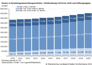 In der Altersgruppe der unter 3-Jährigen besuchten 83 100 Kinder eine Kindertageseinrichtung. Im Vergleich zum Vorjahr ist die Anzahl um 1 405 Kinder gestiegen (+1,7 %). In dieser Altersgruppe nahmen 2020 rund 39 % der Kinder (32 609) eine Ganztagsbetreuung von durchgehend mehr als 7 Stunden pro Betreuungstag in Anspruch.