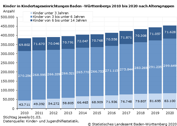 Nach Feststellung des Statistischen Landesamtes wurden in Baden-Württemberg am 1. März 2020 insgesamt 454 377 Kinder in 9 288 Kindertageseinrichtungen (Kindergärten, Krippen, Schülerhorte und altersgemischten Einrichtungen) betreut. Das sind 10 390 Kinder (+2,3 %) und 171 Einrichtungen (+1,9 %) mehr als im Vorjahr.