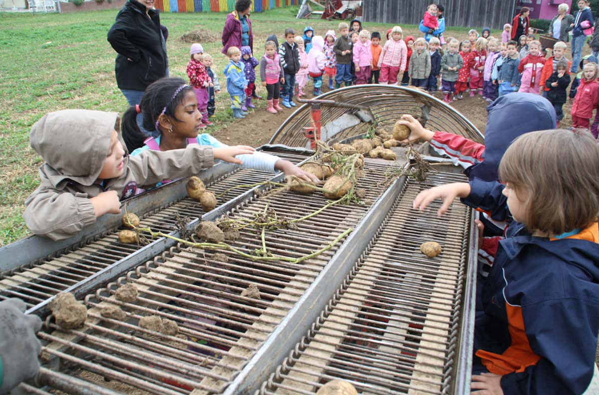 Ein besondere Event ist immer montags. An diesem Tag wird den Kindern der Weg der Kartoffel erklärt und das die Pommes nicht nur aus der Tüte kommen. Angefangen wurde mit den Kleinsten. Der Kindergarten Himmelszelt Dühren war zu Gast. Mit viel Eifer und ausgerüstet mit Gummistiefeln sammelten sie die Kartoffeln aus dem Acker. Die Vorschulkinder durften dann auf der Erntemaschine mitfahren und die Kartoffeln sortieren. Zur Belohnung gab es dann für jeden frische Pommes mit Ketchup und was zu trinken.