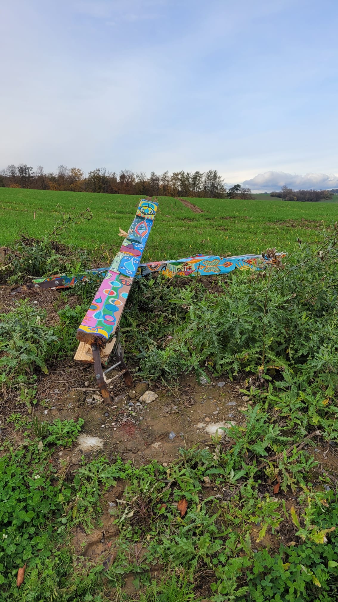 Vorvergangenes Wochenende musste bedauerlicherweise die Beschädigung der Doppelstele „X für U“, die – je nach Betrachtung – Anfang beziehungsweise Ende des Weges darstellt, festgestellt werden. Die Holzstelen wurden aus der Verankerung gerissen und massiv beschädigt. Das Kunstwerk wurde mutmaßlich umgefahren. Entstanden ist ein Schaden von mehreren Tausend Euro.