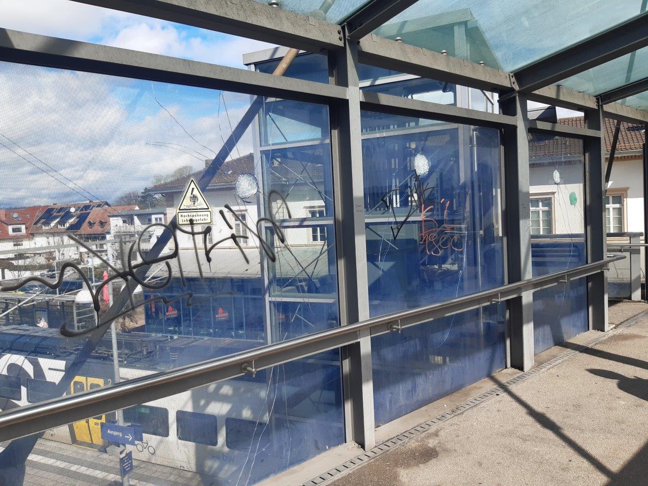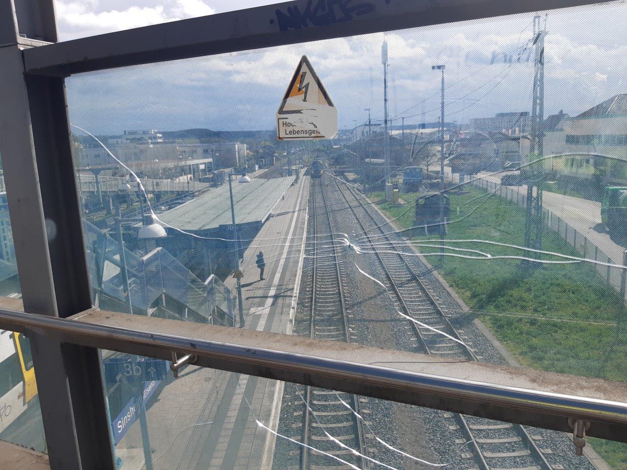 Ende vergangenen Monats – mutmaßlich zwischen dem 25. und 28. März – wurden am Hauptbahnhof Sinsheim Teile der verglasten Seitenwände des Fußgängersteges mutwillig beschädigt. Die Art der Beschädigung deutet darauf hin, dass der oder die Täter einen Hammer oder hammerähnlichen Gegenstand eingesetzt und damit die Scheiben massiv beschädigt haben.