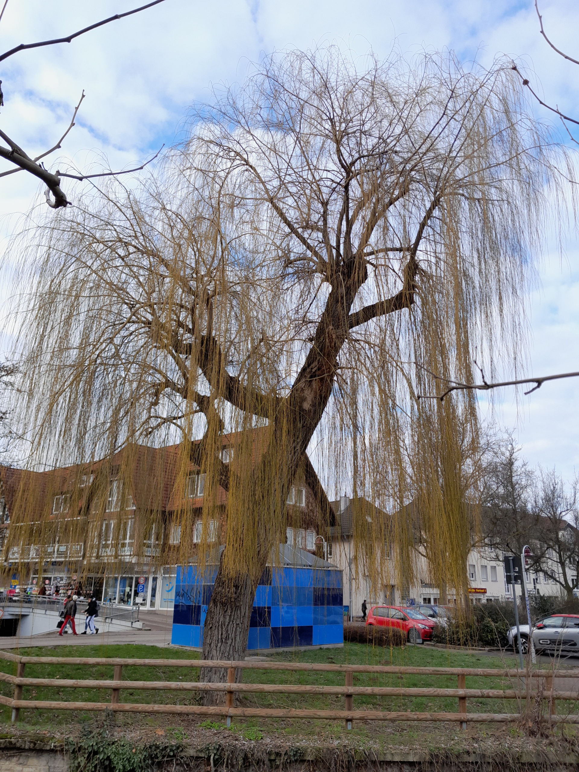 An der ortsbildprägenden Trauerweide am Eingang zum Karlsplatz muss nach eingehender Untersuchung ein massiver Kronenrückschnitt aufgrund einer ausgeprägten Fäule durchgeführt werden, nachdem ein Stämmling bei einem Sturmereignis herausgebrochen ist.