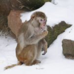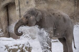 Schnee im eigenen Gehege ist für die Zootiere jedes Mal wieder eine interessante Erfahrung. Wenn die ersten Flocken fallen, kommen die Rhesusaffen nur vorsichtig aus dem Affenhaus. Bevor die ersten Affen den Schritt auf das kalte Weiß wagen, wird zunächst genau ertastet, wie es sich anfühlt – kalt und feucht, aber ungefährlich. Bei den großen Asiatischen Elefanten wird der frische Schnee ebenfalls zunächst intensiv berüsselt und ab und zu sogar als Spielmöglichkeit genutzt.