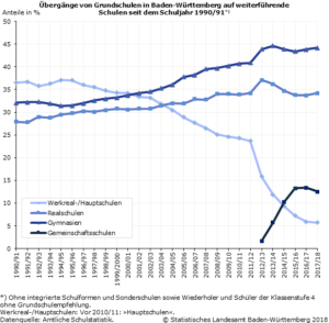 Zum Schuljahr 2017/18 standen insgesamt 91 4441 Viertklässler im Land vor der Entscheidung, auf welche weiterführende Schule sie wechseln sollen. Dies bedeutete im Vergleich zum Vorjahr einen leichten Zuwachs (0,4 %).Trotz der leicht steigenden Anzahl der Übertritte konnten nur die Realschule mit rund 600 und das Gymnasium mit knapp 500 Übergängen mehr im Vergleich zum letzten Schuljahr Anstiege von 2,0 % bzw. 1,2 % verzeichnen. Mit rund 800 Übergängen weniger als im Vorjahr (−6,6 %) verzeichneten die sich weiterhin im Aufbau befindenden Gemeinschaftsschulen erstmals rückläufige Übergangszahlen. Ebenso gingen die Übergänge auf Werkreal-/Hauptschulen um knapp 200 zurück (−3,6 %).