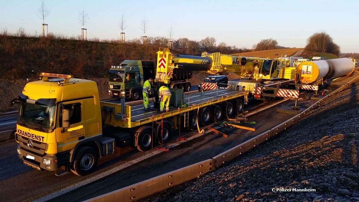 Der Schwertransport, der insgesamt ein Gewicht von 105 Tonnen aufwies -der transportierte Turm der Windkraftanlage wog alleine 65 Tonnen- setzte seine Fahrt nach dem Umladen mit einem Ersatz-Vierachsanhänger, einem sogenannten „Nachläufer“, zu seinem Bestimmungsort im Enzkreis fort. Ausgangsort der Fahrt war am Dienstagnachmittag eine Gemeinde im Landkreis Neumarkt in der Oberpfalz.