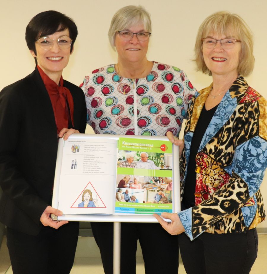 (Quelle: Landratsamt Rhein-Neckar-Kreis): Die Sozialdezernentin des Rhein-Neckar-Kreises, Stefanie Jansen (l.), Elisabeth Sauer, Vorsitzende des Kreisseniorenrats (r.) und ihre Stellvertreterin Anna Oehne-Marquard präsentieren den neuen Wegweiser für ältere Menschen im Landkreis.