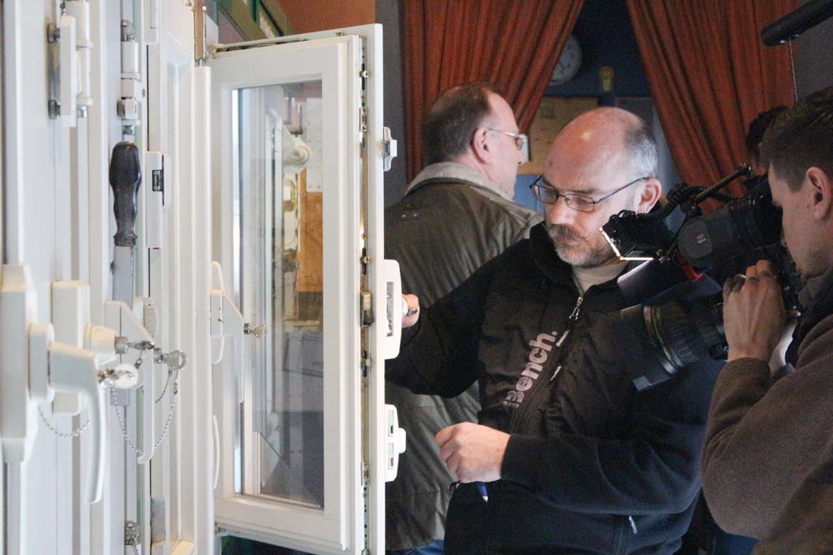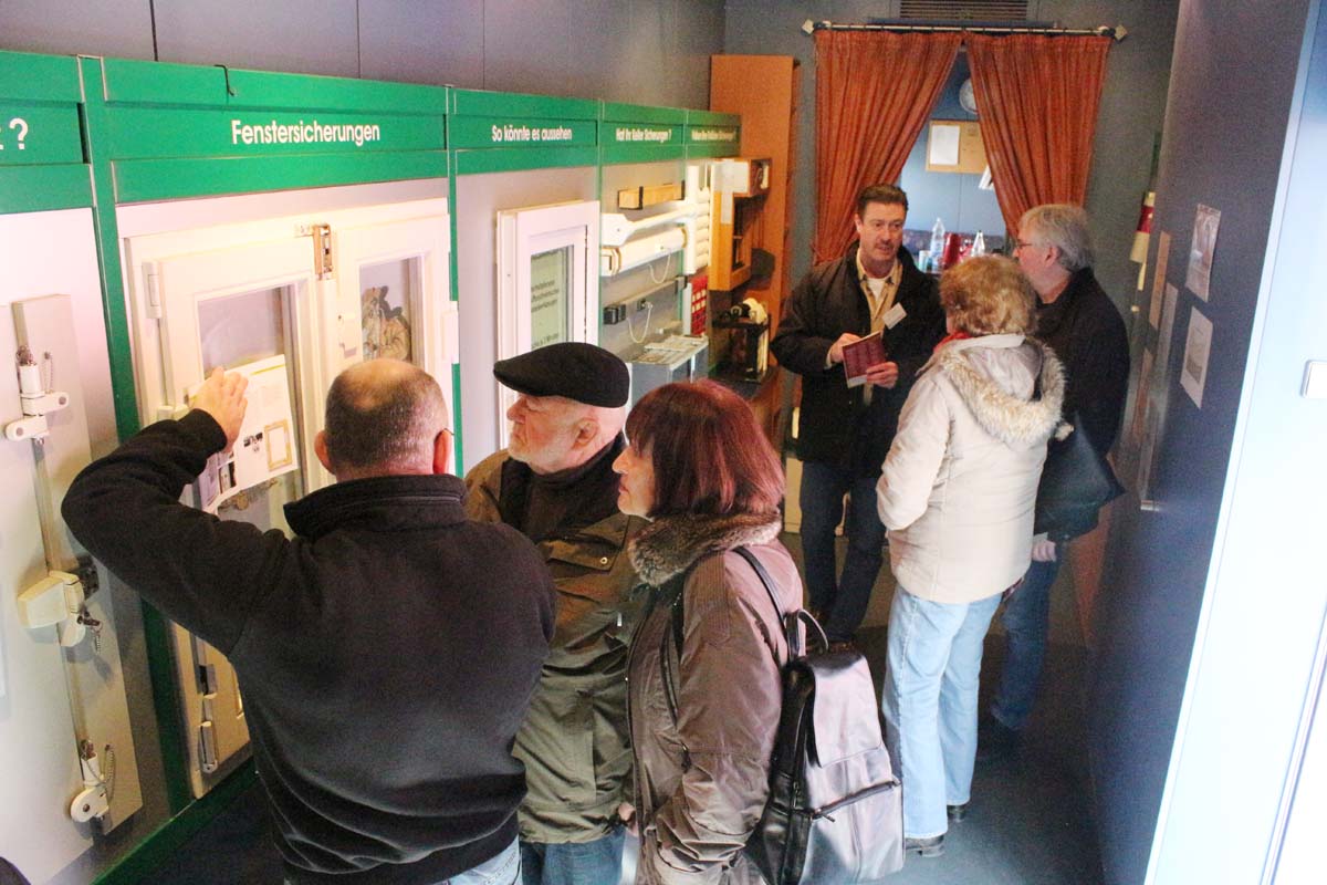 (cr) Reges Kommen und Gehen herrschte am Donnerstag beim Informationsfahrzeug des Landeskriminalamtes Baden Württemberg zum Thema „Wirksamer Schutz vor Wohnungseinbruch“ in Sinsheim „beim Wächter“. Sogar das Fernsehen war zu Gast um darüber zu berichten. Hier konnte man sich umfangreich über Einbruchsschutz und Sicherungsanlagen rund ums Haus und Wohnung informieren. Vorrangig sollten Kellerfenster und Terassentüren abgesichert werden. Einige Sicherungen lassen sich kostengünstig mit einfachen Mitteln installieren.