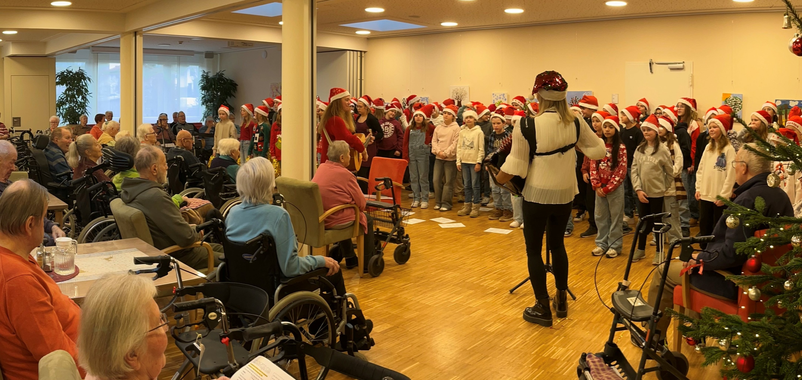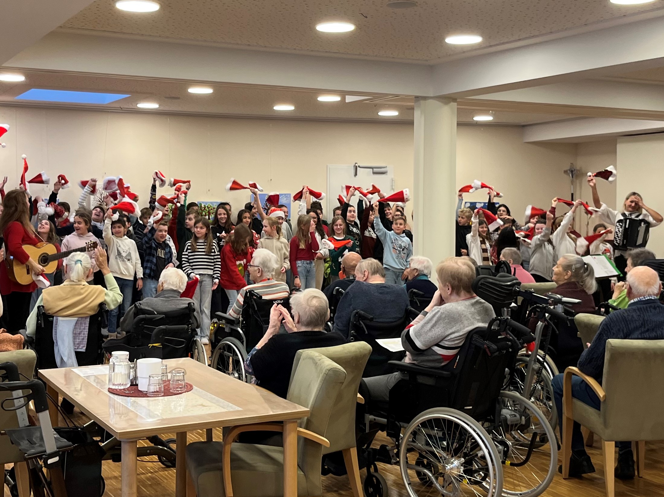 Zum Weihnachtssingen waren die Singklassen dann zunächst im Johanniterhaus in Waibstadt. Die Chorkinder waren in großer Zahl von Sinsheim nach Waibstadt gekommen, um weihnachtliche Stimmung zu den Seniorinnen und Senioren zu bringen. Angeregt hatte den Besuch Frau Dr. Kaltenmaier von der Hausärztegemeinschaft Kaltenmaier und Aldanmaz. Statt Weihnachtsgeschenke gab es von der Praxis für die Bewohnerinnen und Bewohner des Johanniterhauses Weihnachtslieder. Frau Dr. Klaltenmaier organisierte einen Bus der Firma Gferer, der 60 Schülerinnen und Schüler nach Waibstadt fuhr und fünf Mütter und Väter übernahmen mit Privat-PK noch den weiteren Fahrdienst.