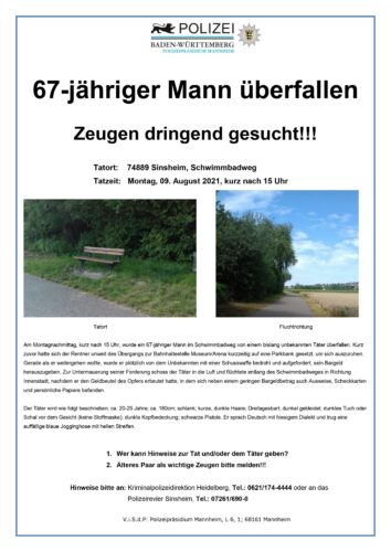 Nach wie vor wird nach dem älteren Pärchen gesucht, die das Geschehen beobachtet haben dürften und nach der Tat ebenfalls in Richtung Innenstadt weitergingen. Diese für die Fahnder wichtigen Zeugen, sowie weitere Personen, die Hinweise zum Täter (ca. 20-25 Jahre; ca. 180 cm; normale Statur; dunkel gekleidet; dunkles Tuch oder Schal vor dem Gesicht -keine Stoffmaske-; schwarze Pistole; Dreitagebart. Er sprach Deutsch mit hiesigem Dialekt und trug eine auffällige blaue Jogginghose mit hellen Streifen) geben können, werden gebeten, sich mit dem Kriminaldauerdienst, Tel.: 0621/174-4444 oder mit dem Polizeirevier Sinsheim, Tel.: 07261/690-0 in Verbindung zu setzen.