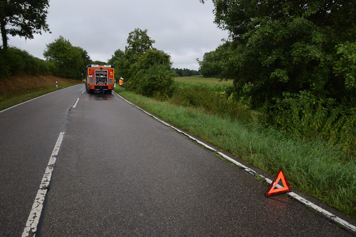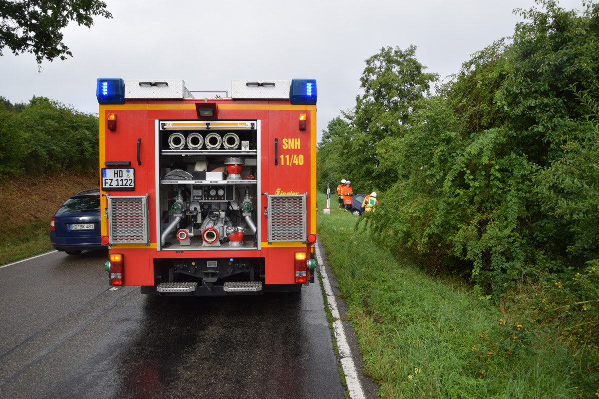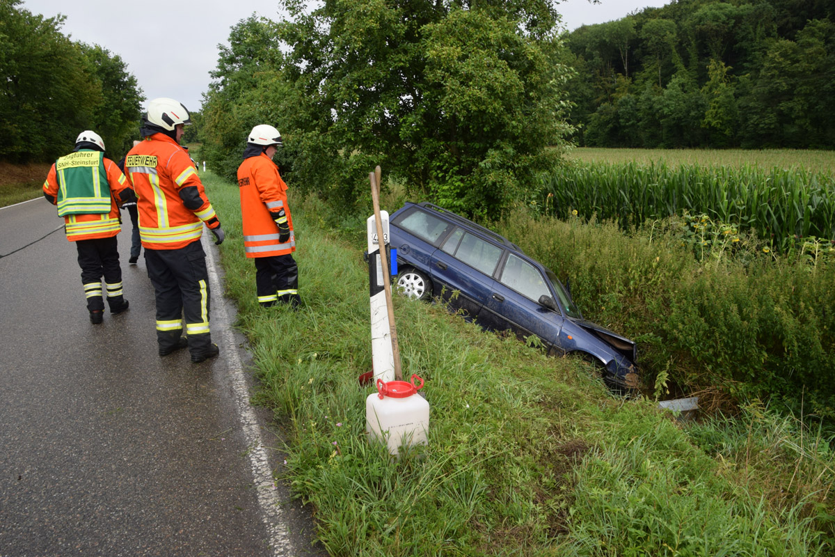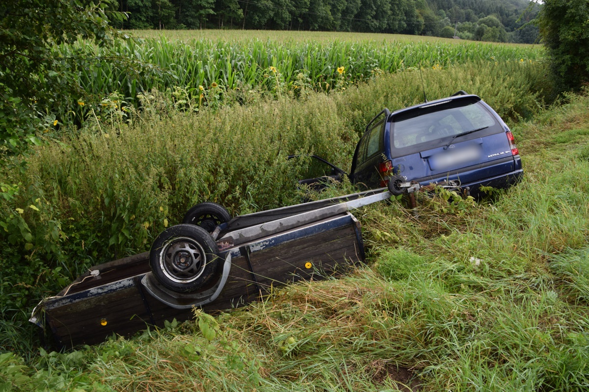 Sinsheim-Adersbach. (red) Glück im Unglück hatten zwei Insassen eines Opel Astra bei einem Unfall am Mittwoch auf der Kreisverbindungsstraße 4283 bei Adersbach. Die beiden Unfallbeteiligten hatten gegen 17.40 Uhr die K 4283 von Steinsfurt in Richtung Adersbach befahren und kamen wenige hundert Meter vor dem Ortseingang Adersbach nach rechts von der Fahrbahn ab. Der Wagen fuhr in der Folge die Böschung hinunter und prallte gegen einen Bachlauf – der angekoppelte Anhänger überschlug sich. Die beiden Insassen konnten sich glücklicherweise unverletzt aus dem Unfallfahrzeug befreien. Die Feuerwehr Steinsfurt war mit einem Fahrzeug sowie sechs Mann vor Ort und verhinderte, dass die Betriebsstoffe des verunfallten Wagens in den Goldbach gelangten. Am Opel entstand wirtschaftlicher Totalschaden. Während der Unfallaufnahme war die Fahrbahn halbseitig gesperrt. Eine Streifenwagenbesatzung des Sinsheimer Polizeireviers war vor Ort und übernimmt die weiteren Ermittlungen.