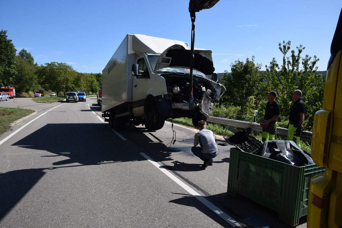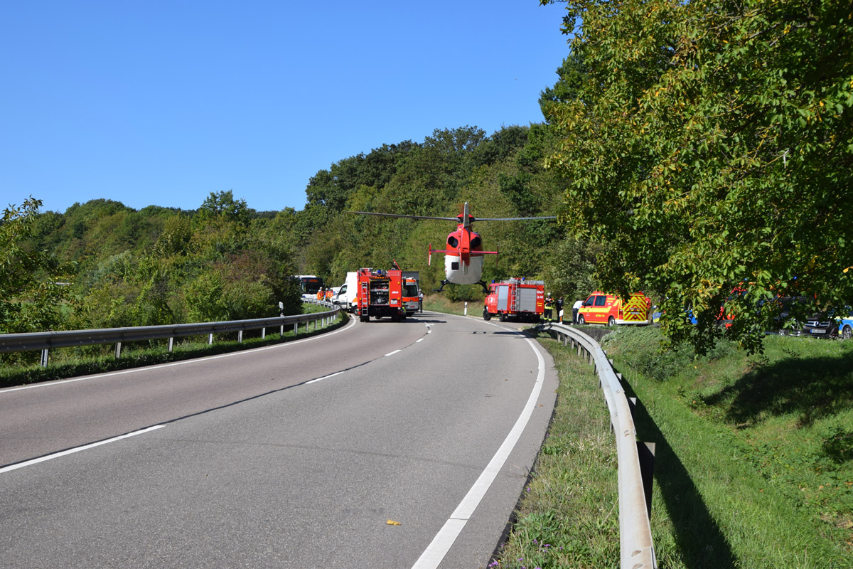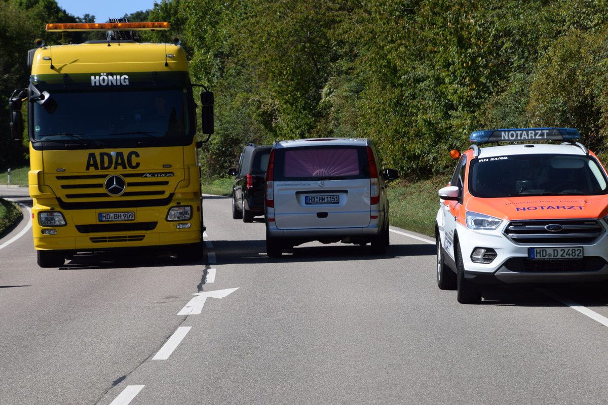 Nach den derzeitigen Erkenntnissen fuhr der 71-jährige Fahrer eines Klein-Lkw von einem Parkplatz zwischen den Sinsheimer Ortsteilen Dühren und Eschelbach auf die B 292/B 39 in Richtung Eschelbach und geriet dabei aus bislang auf die Gegenfahrbahn, wo er mit einem Kleinwagen kollidierte, der mit zwei Personen besetzt war. Durch die Wucht des Aufpralls wurde der Kleinwagen über die Leitplanke und anschließend eine Böschung hinuntergeschleudert.