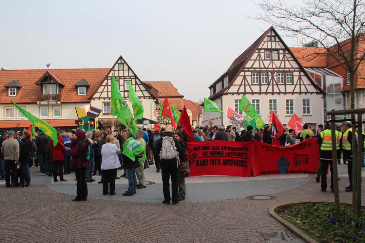 (cr) Ein klares Zeichen gegen Nazis setzten die Sinsheimer Organisation am Samstag bei ihrer Kundgebung am bunten Sinsheimer Wächter. Etwa 300 Sinsheimer hatten sich aufgerafft dieser Veranstaltung beizuwohnen. Dies ist für Sinsheim schon mal ein ansehnlicher Erfolg. Mit von der Partie neben den Who ist Who von Politik und Wirtschaft aus Sinsheim und seinen Nachbargemeinden war auch das Holger Weitz Trio. Schade das sich am Ende der Veranstaltung die Kundgebung nicht entscheiden konnte in welche Richtung man durch die Strassen von Sinsheim ziehen wollte. Ein paar Unbelehrbare mussten auch wieder unsere Ordnungskräfte provozieren in dem sie versuchten zu einer Gegenveranstaltung abseits der erlaubten Kundgebung zu kommen.