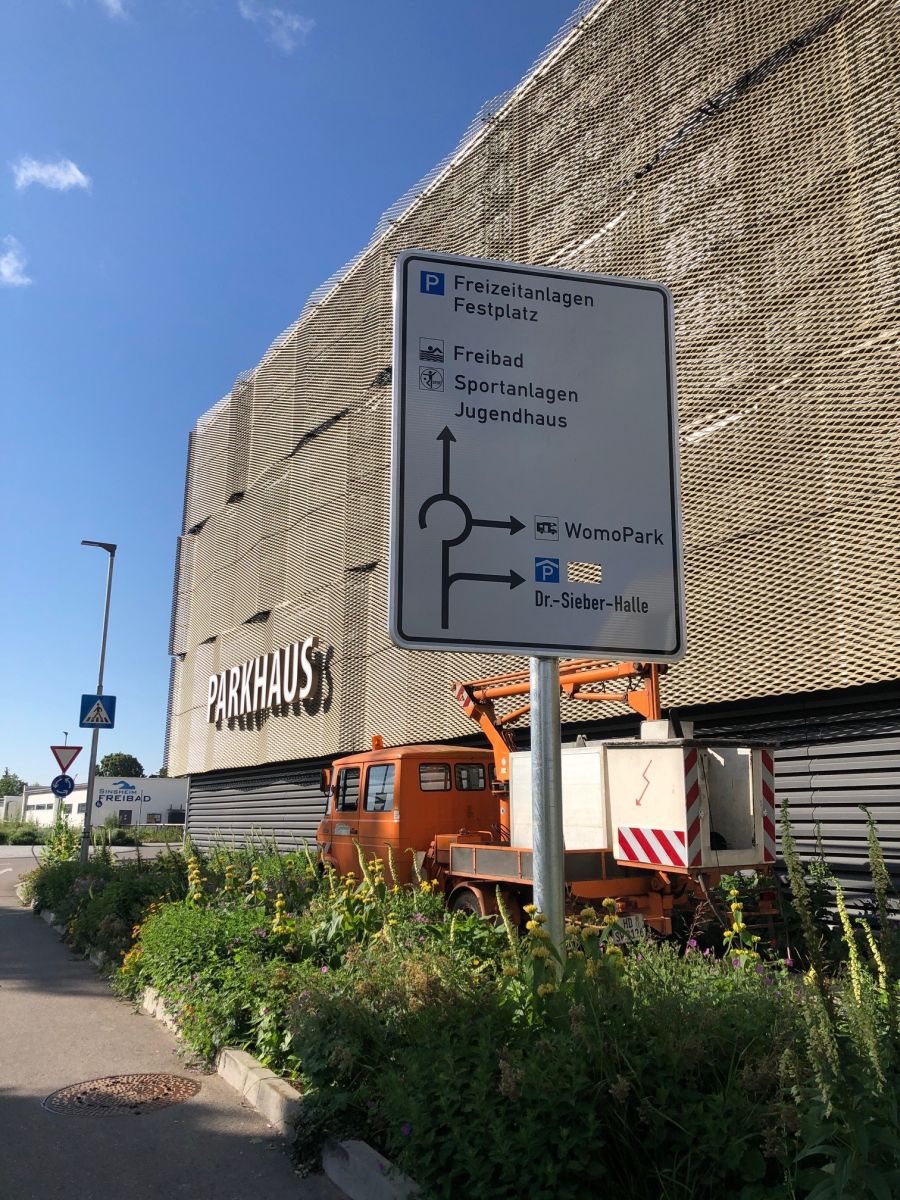 Bild (Stadtwerke Sinsheim): Demnächst weisen Vorwegweiser auf die Belegung des Parkhauses Dr.-Sieber-Halle hin. Noch ist die Fertigstellung der Anlagen nicht abgeschlossen.