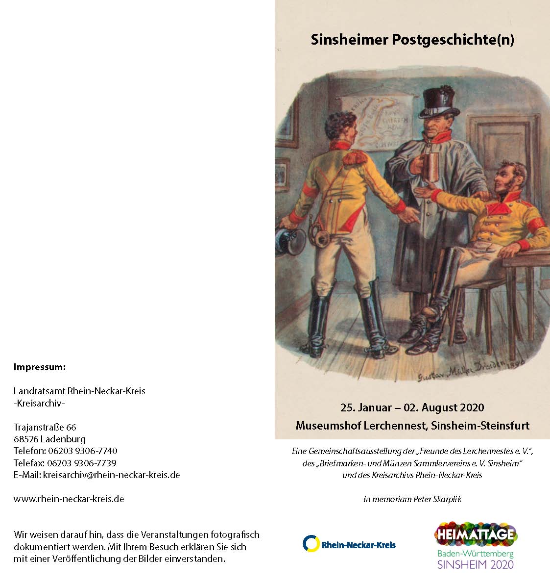 Hand aufs Herz: Wer weiß heute noch Bescheid über Begriffe wie Posthalterei, Brieflade und Uhrradstempel, Fahrpost- oder Bahnexpedition? Mit diesen längst aus dem Blickfeld der Öffentlichkeit verschwundenen, aber für die Nachrichtenübermittlung über mehrere Jahrhunderte existenziellen Dinge befasst sich eine spannende Ausstellung zur Sinsheimer Postgeschichte. Zu sehen ist sie im Museumshof Lerchennest in Sinsheim-Steinsfurt im Rahmen der Heimatstage Baden-Württemberg und zum 1250-jährigen Stadtjubiläum. Die Gemeinschaftsausstellung der „Freunde des Lerchennestes e.V.“, des „Briefmarken- und Münzsammelvereins e.V. Sinsheim“ und des Kreisarchivs Rhein-Neckar-Kreis bietet einen interessanten und vielschichtigen Überblick über die spannende Postgeschichte Sinsheims und seiner Stadtteile von den Anfängen bis zur Gegenwart. Zur Vernissage am Freitag, 24.01.2020, 18 Uhr, in der Lerchenneststraße 18 in Sinsheim-Steinsfurt sind alle Interessierten herzlich eingeladen; der Eintritt ist frei.