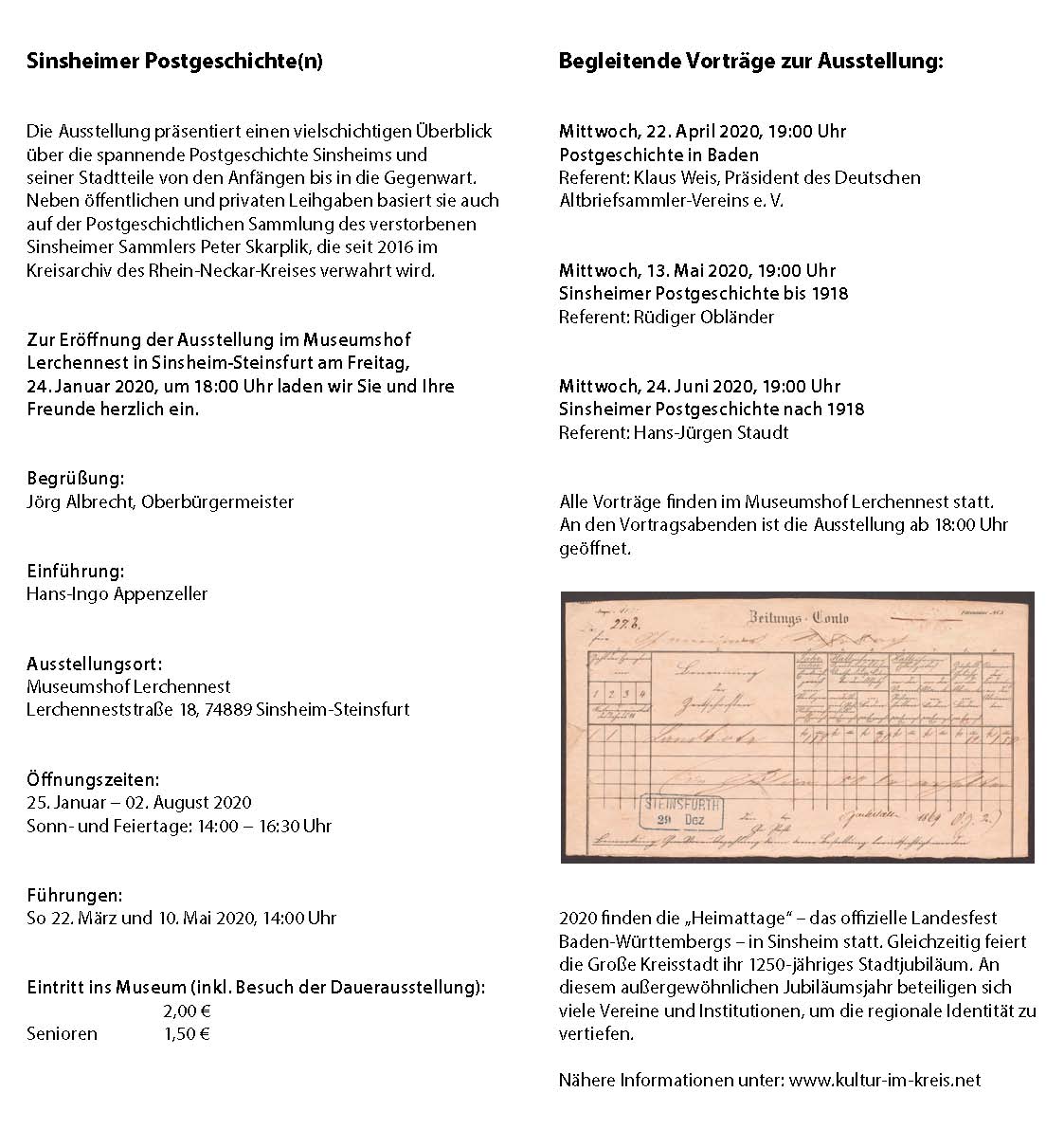 Interessante Vorträge im Rahmen der Ausstellung runden diesen Blick auf einen bedeutenden Aspekt der regionalen Geschichte ab. Am Mittwoch, 22. April 2020, 19 Uhr, spricht Klaus Weis, Präsident des Deutschen Altbriefsammler-Vereins e.V., über die „Postgeschichte in Baden“. Am Mittwoch, 13. Mai 2020, 19 Uhr, berichtet Rüdiger Obländer, Vorsitzender des Briefmarken und Münzen Sammlervereins Sinsheim, über die „Sinsheimer Postgeschichte bis 1918“ und am Mittwoch, 24. Juni 2020, 19 Uhr, befasst sich Hans-Jürgen Staudt, ebenfalls engagiertes Vereinsmitglied mit der „Sinsheimer Postgeschichte nach 1918“.