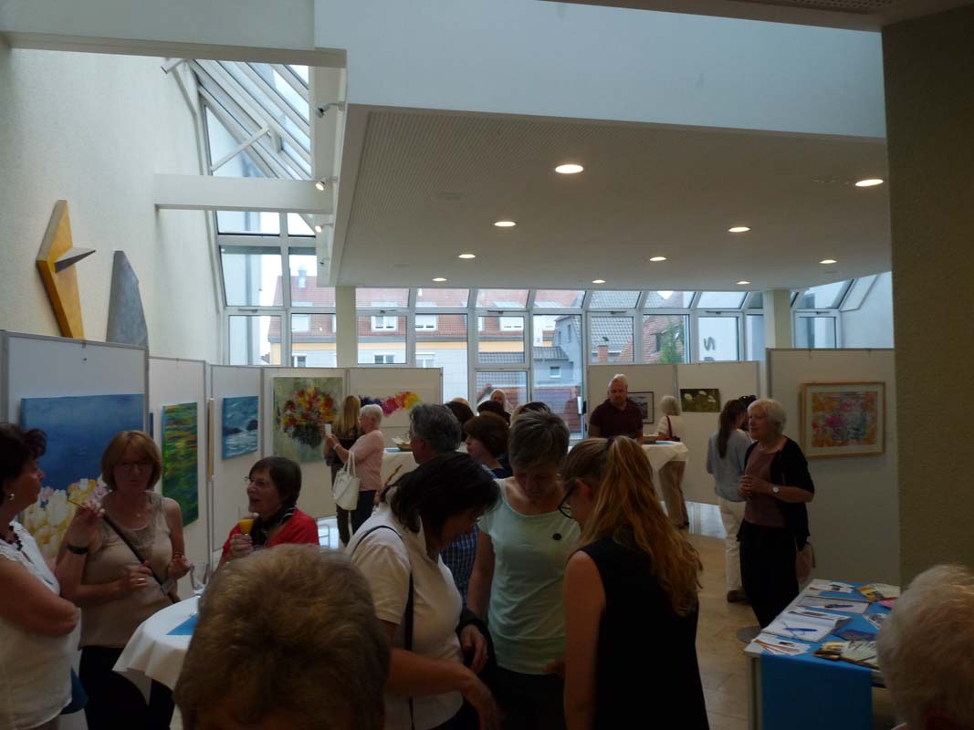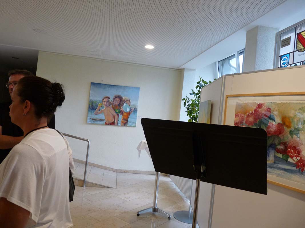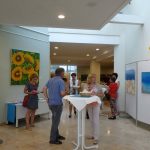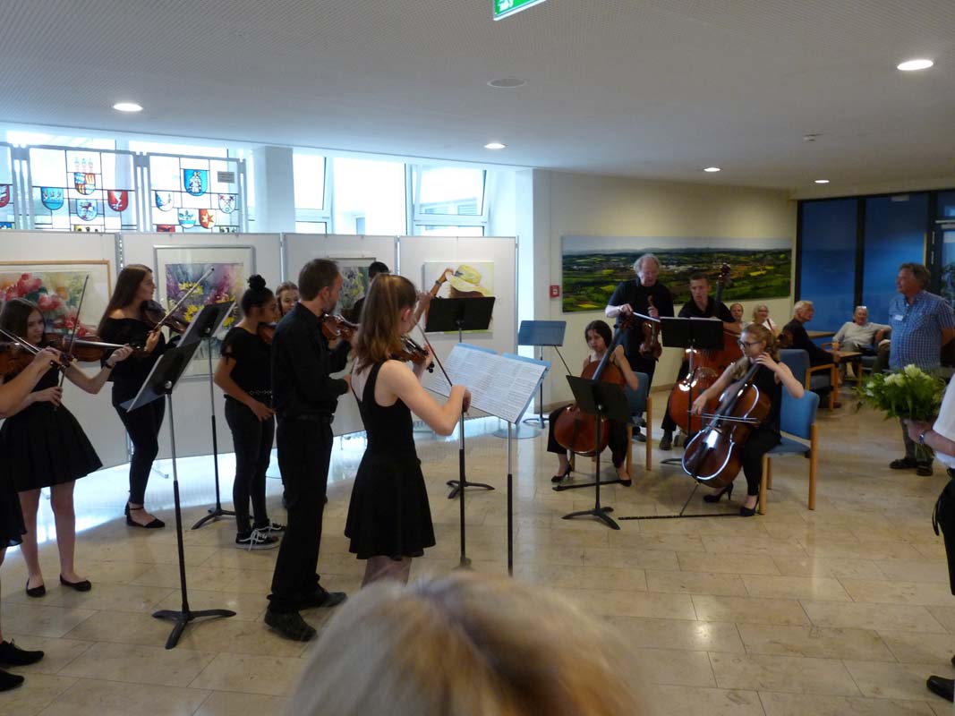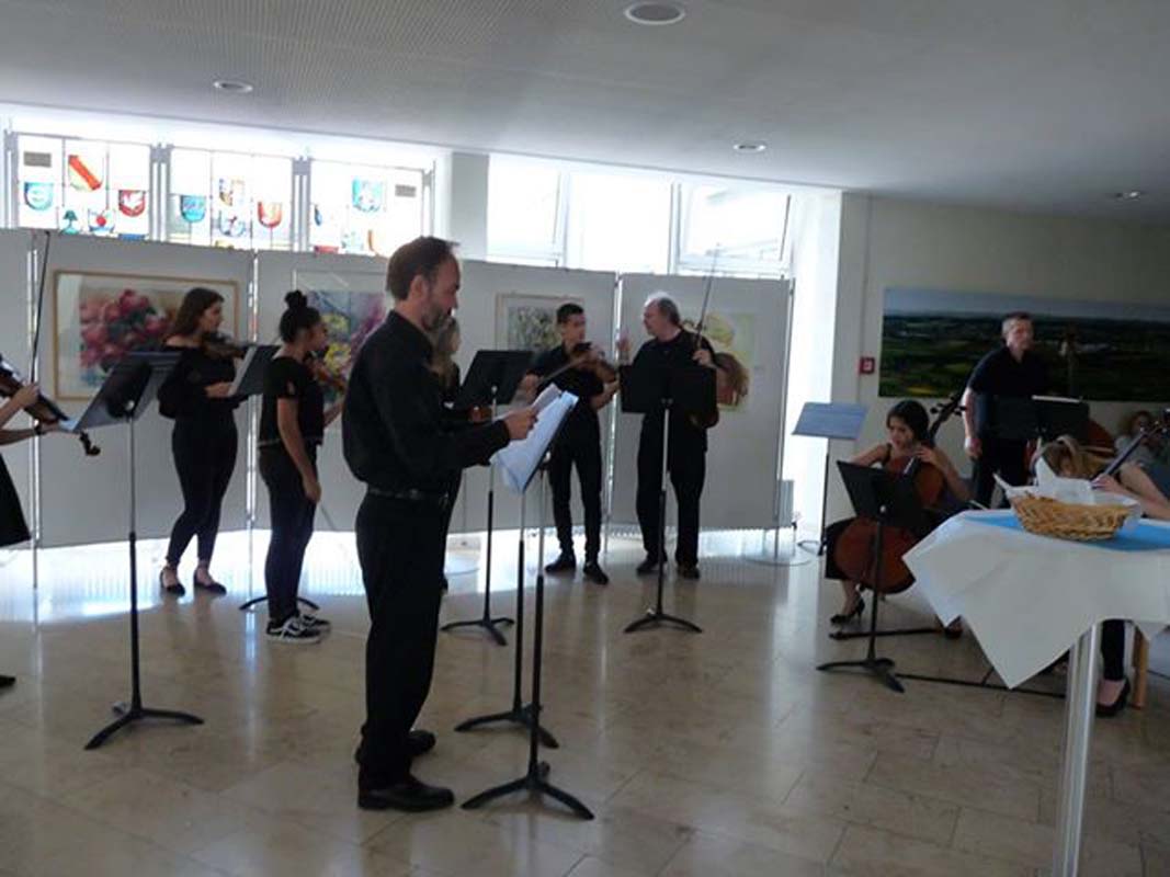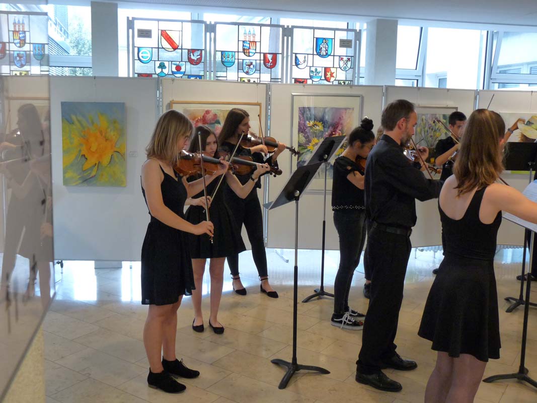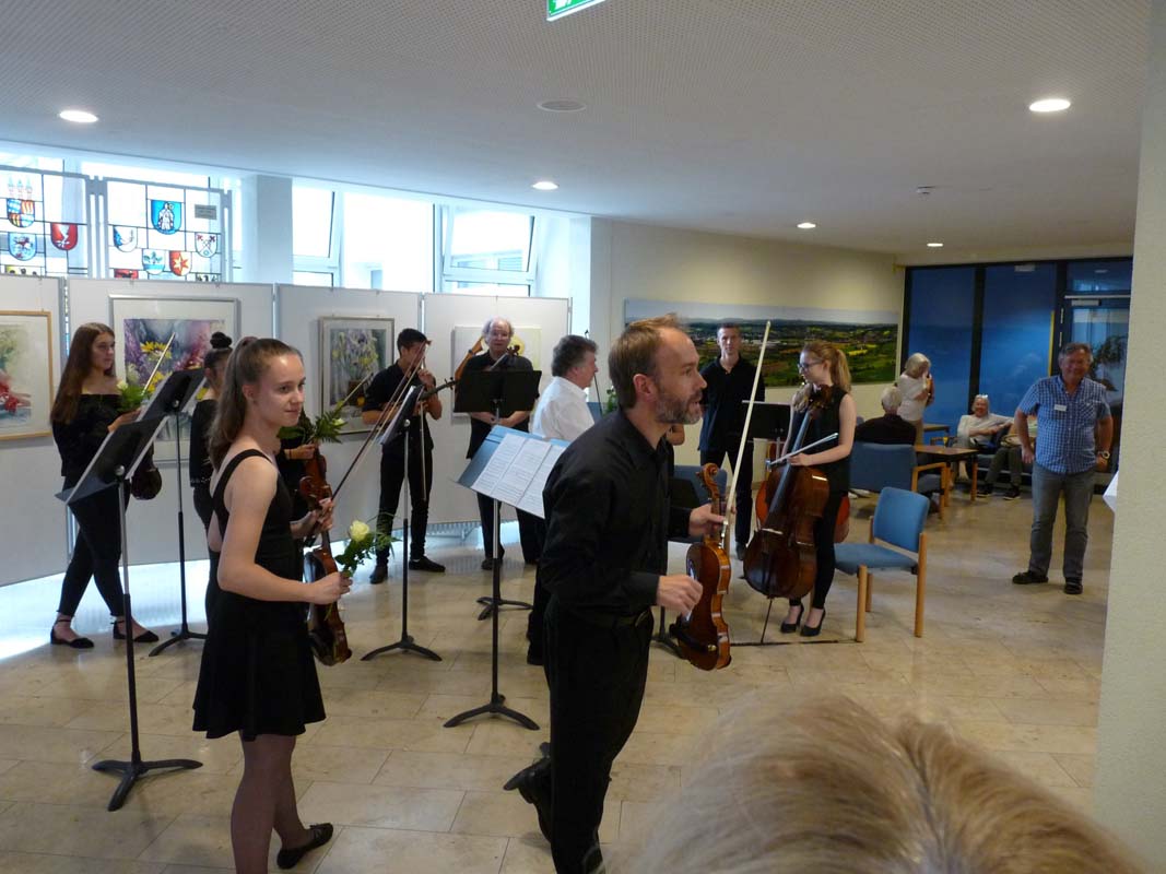 (zg) Sommerleichte Kunst, klangvolle Musik und temperamentvolle Reden begeisterten die Besucher der Vernissage. Getränke und Knabbereien unterstützten die gute Stimmung. Sinsheims Oberbürgermeister Jörg Albrecht erwähnte in seiner Begrüßung die lobenswerte Zusammenarbeit mit dem Kunstkreis Kraichgau und der Städtischen Musikschule. 12 MusikerInnen des Kammermusikensembles beeindruckten mit gefühlvollen Passagen und kräftigem Sound. Gewohnt temperamentvoll betrachtete der Laudator Franz Anton Bankuti die SommerART von verschiedensten Seiten.