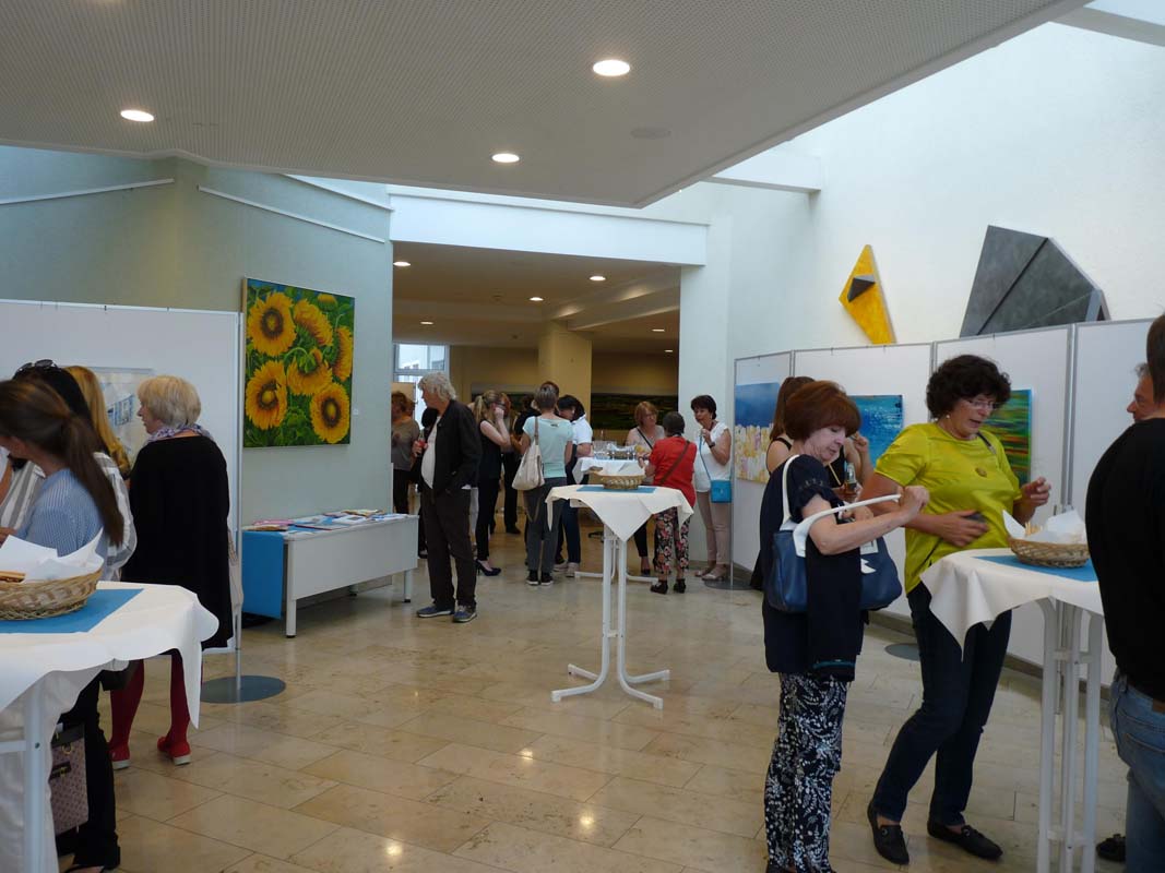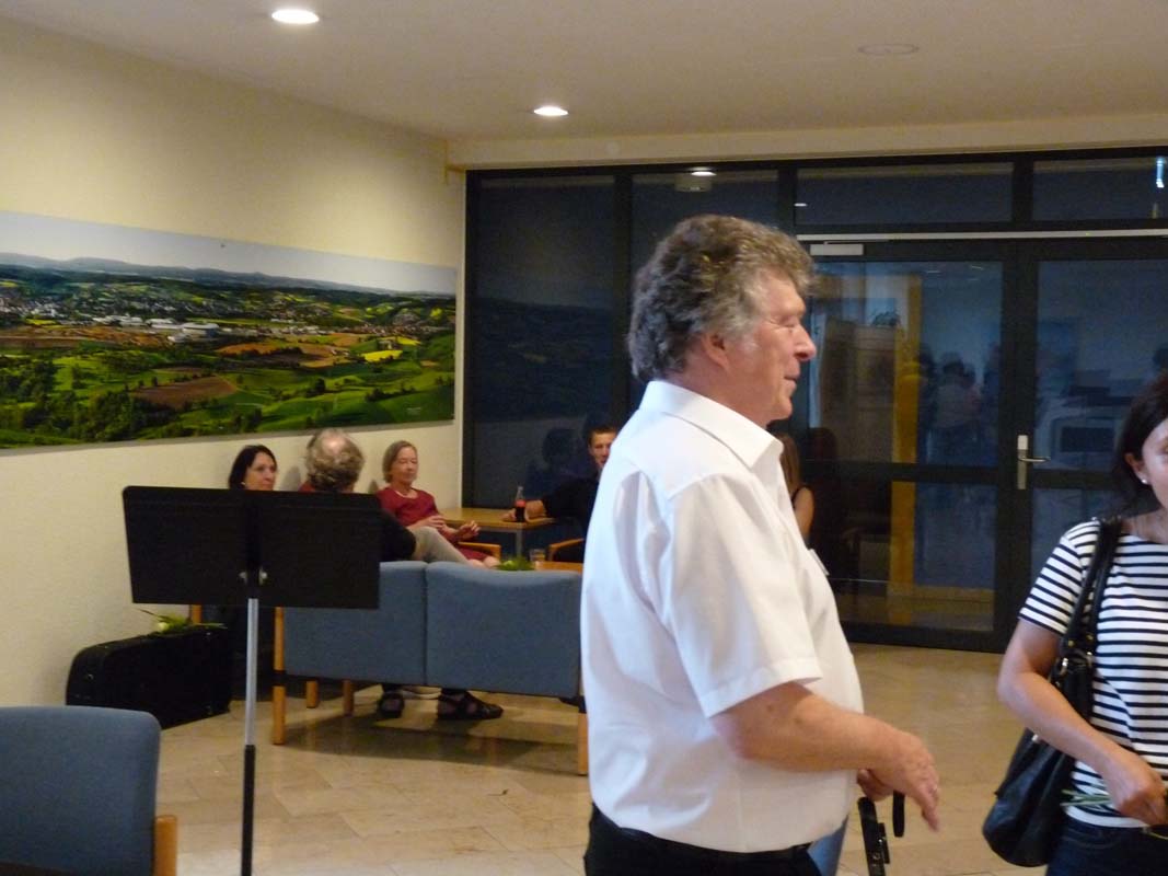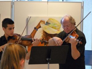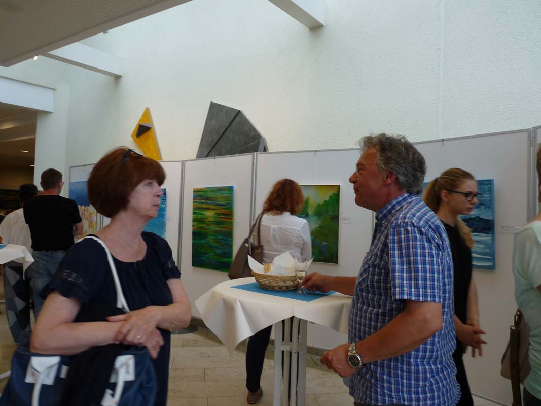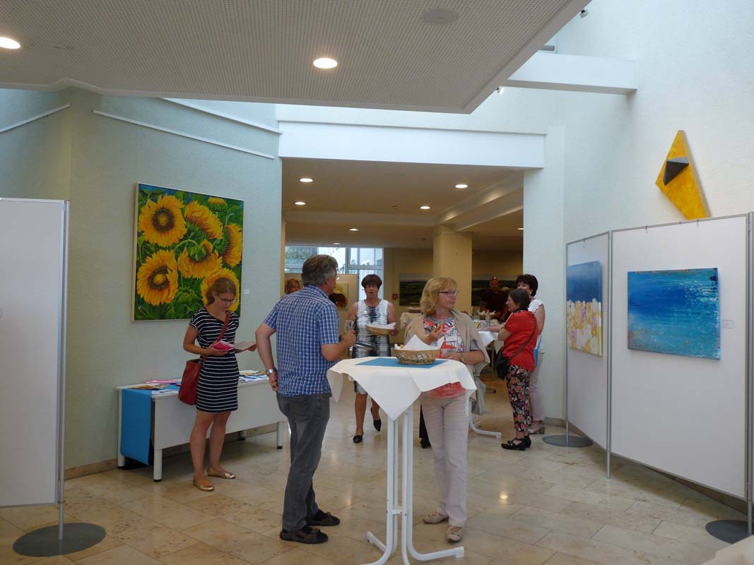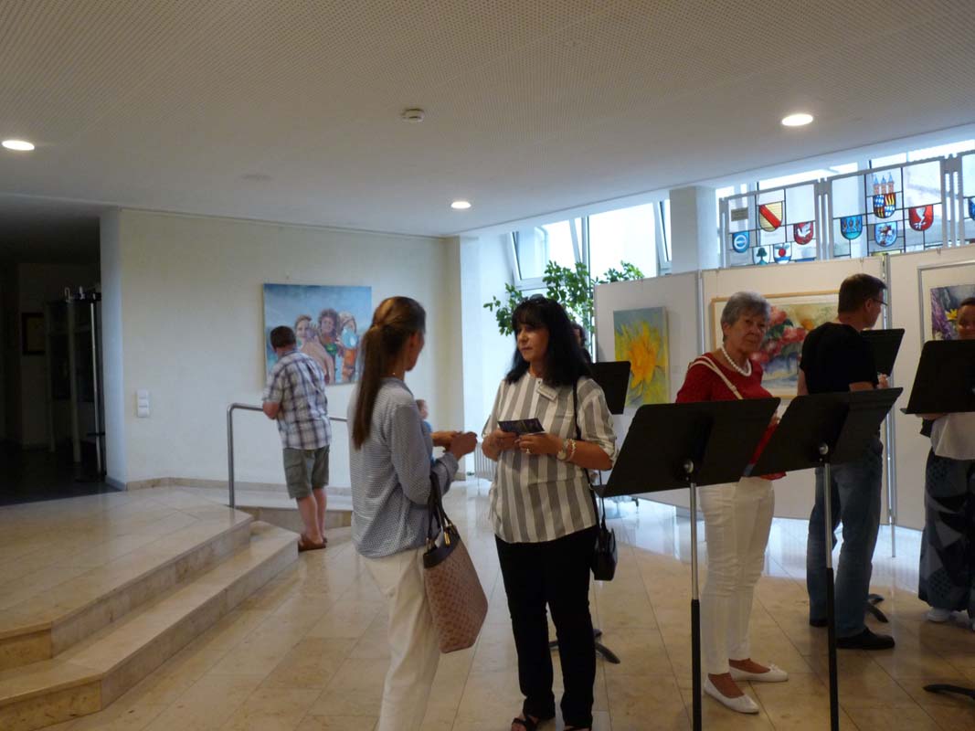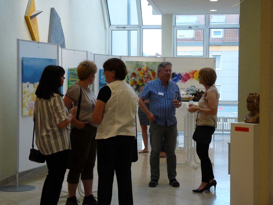(zg) Sommerleichte Kunst, klangvolle Musik und temperamentvolle Reden begeisterten die Besucher der Vernissage. Getränke und Knabbereien unterstützten die gute Stimmung. Sinsheims Oberbürgermeister Jörg Albrecht erwähnte in seiner Begrüßung die lobenswerte Zusammenarbeit mit dem Kunstkreis Kraichgau und der Städtischen Musikschule. 12 MusikerInnen des Kammermusikensembles beeindruckten mit gefühlvollen Passagen und kräftigem Sound. Gewohnt temperamentvoll betrachtete der Laudator Franz Anton Bankuti die SommerART von verschiedensten Seiten.