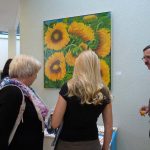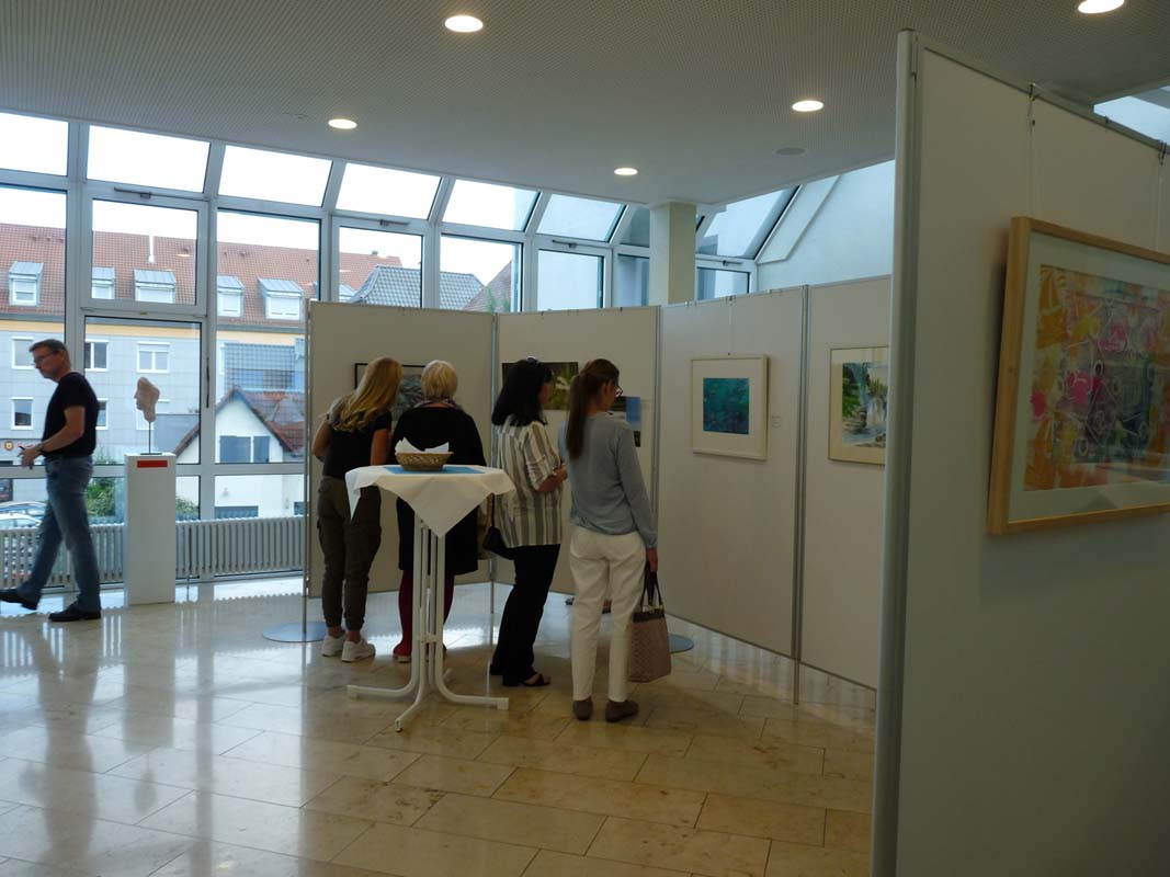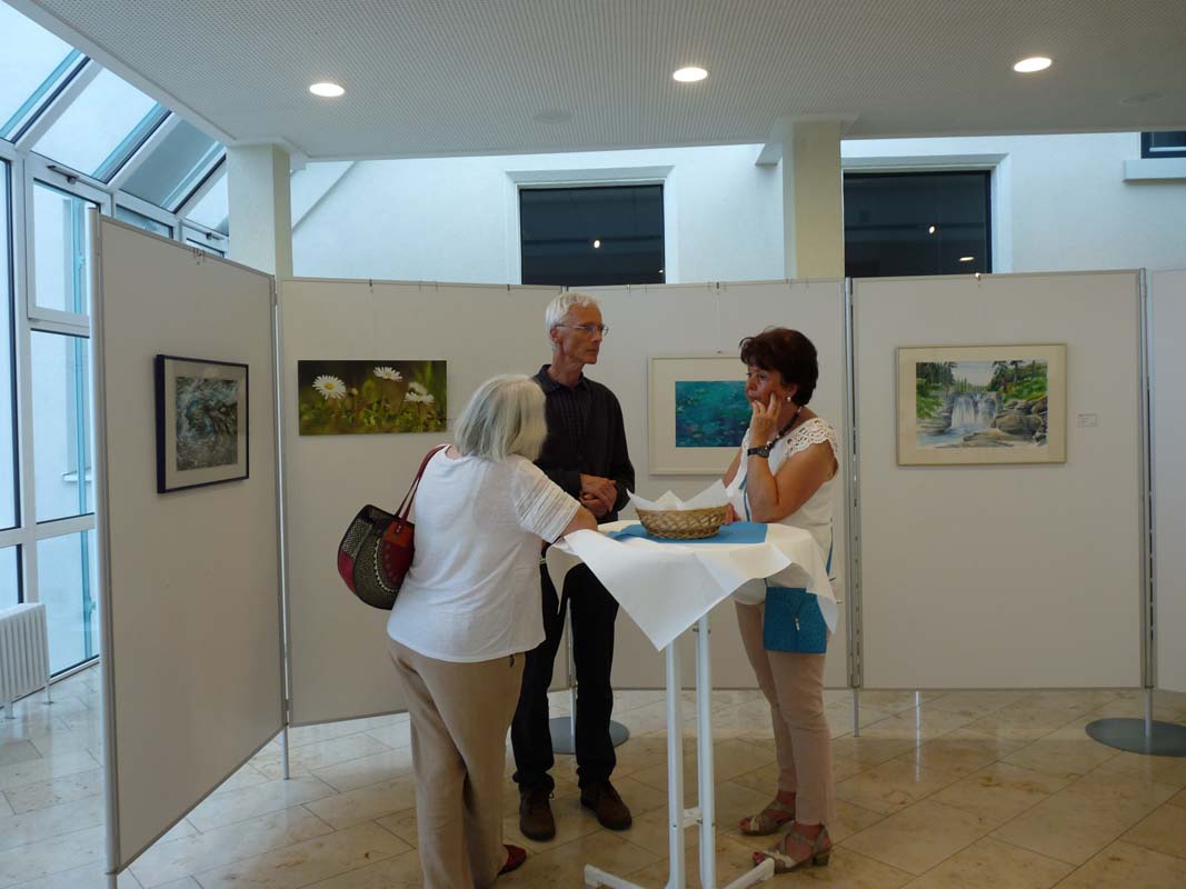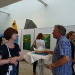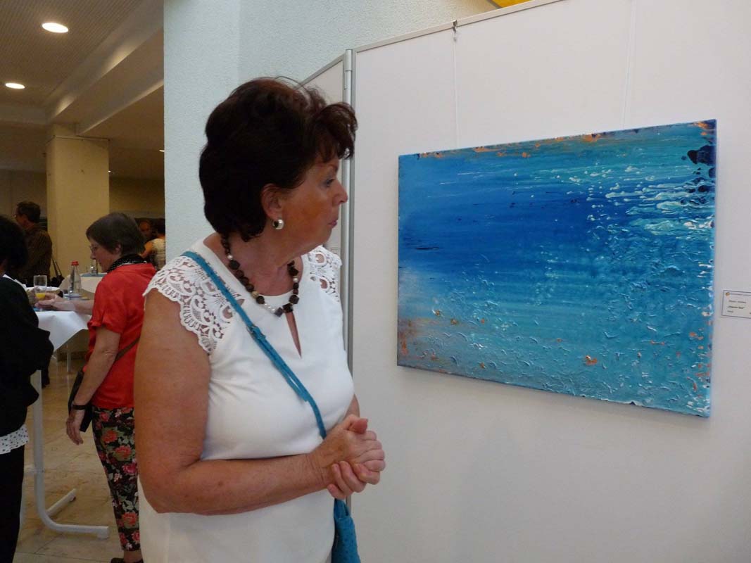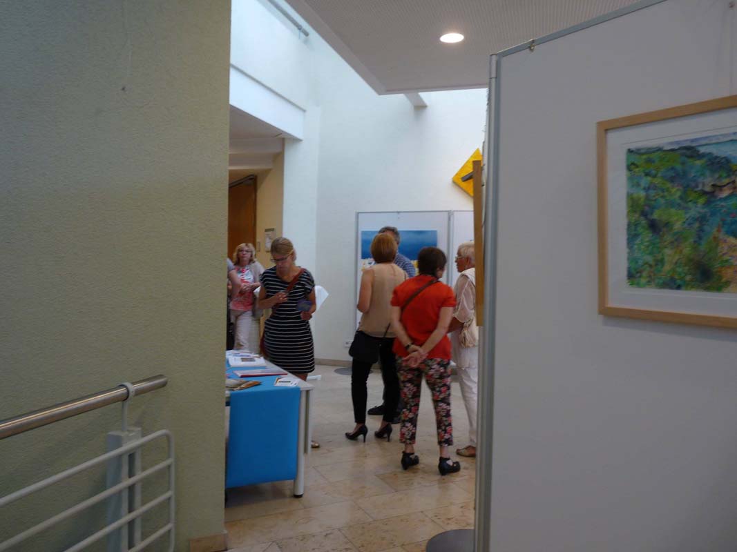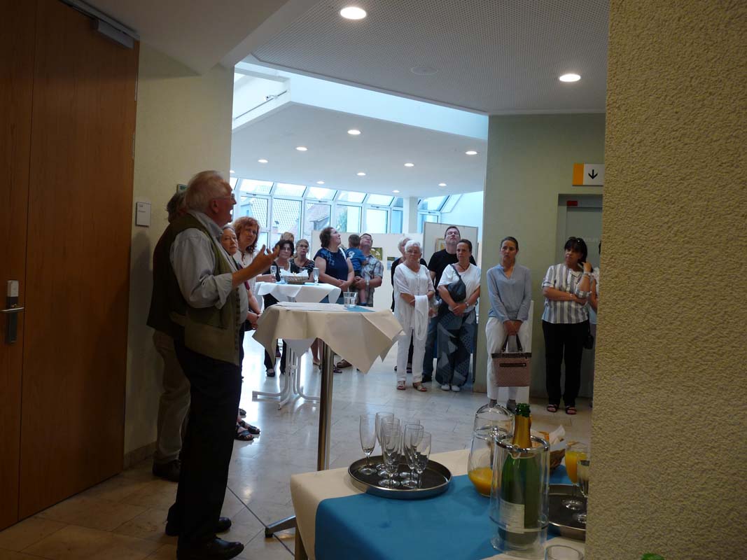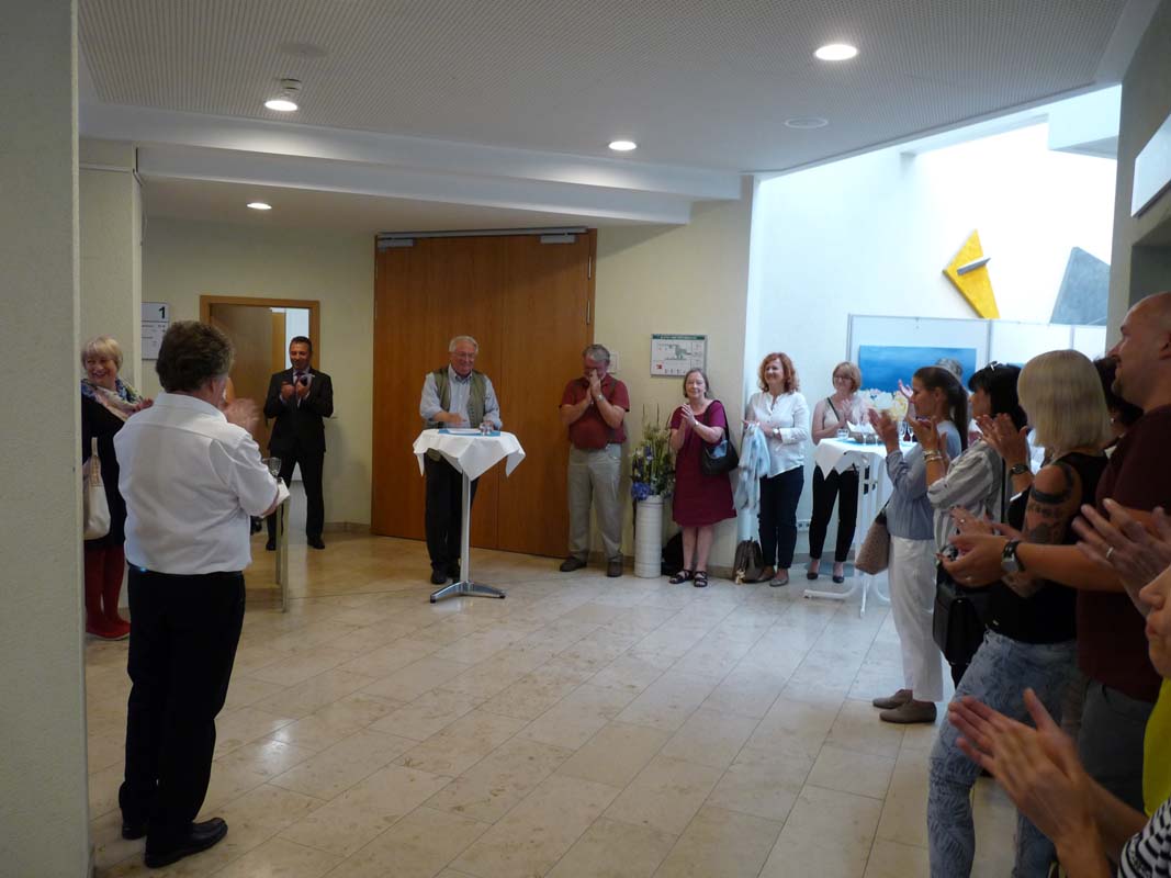 (zg) Sommerleichte Kunst, klangvolle Musik und temperamentvolle Reden begeisterten die Besucher der Vernissage. Getränke und Knabbereien unterstützten die gute Stimmung. Sinsheims Oberbürgermeister Jörg Albrecht erwähnte in seiner Begrüßung die lobenswerte Zusammenarbeit mit dem Kunstkreis Kraichgau und der Städtischen Musikschule. 12 MusikerInnen des Kammermusikensembles beeindruckten mit gefühlvollen Passagen und kräftigem Sound. Gewohnt temperamentvoll betrachtete der Laudator Franz Anton Bankuti die SommerART von verschiedensten Seiten.