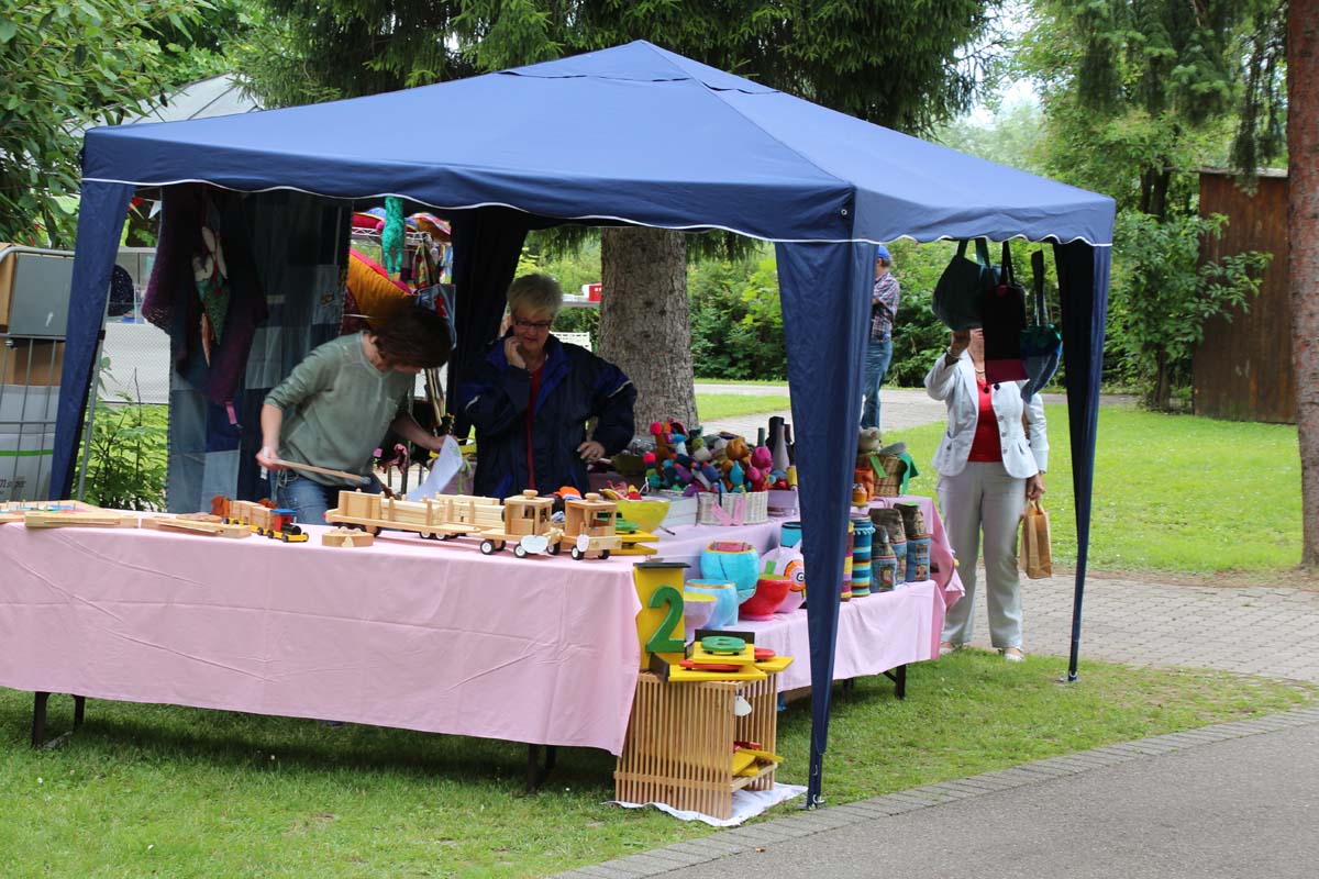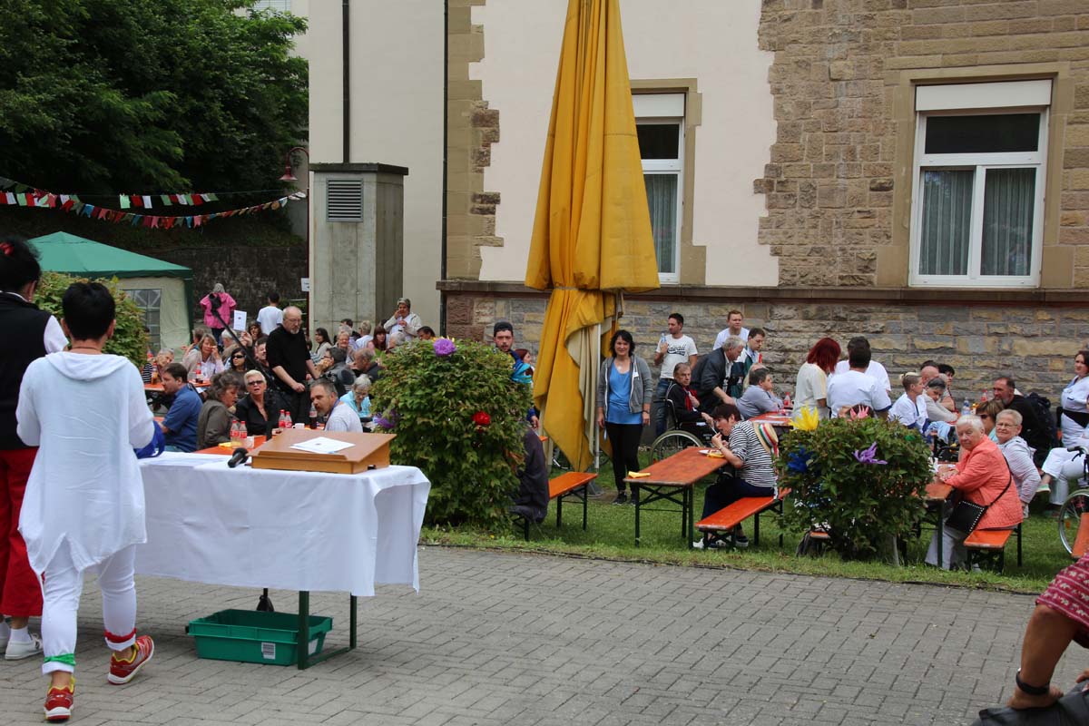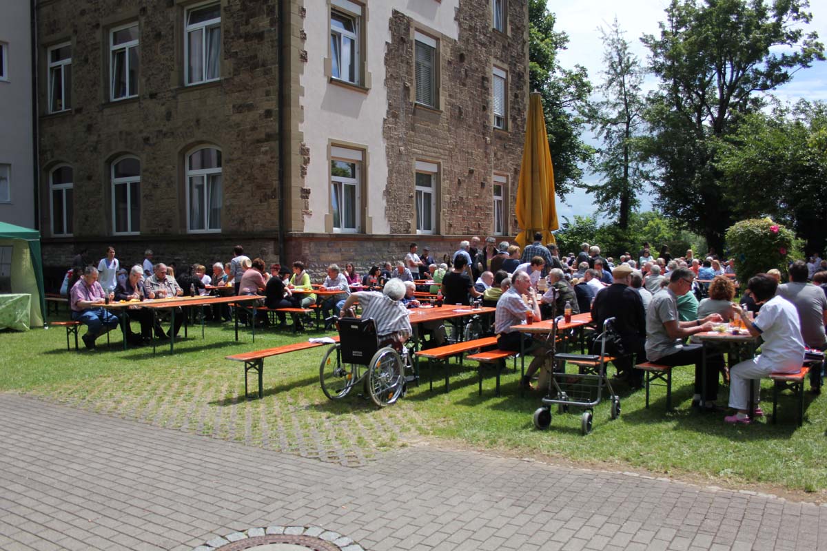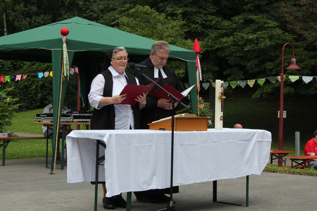 Trotz eines kleinen Schauers, der viele Gäste unter die Schirme und Pavillons flüchten ließ, war es wieder ein sehr gelungenes Fest. Auch der neue evangelische Heim- und Klinikseelsorger Pfarrer Schaber und seine katholische Mitstreiterin,Schwester Regina, die den Eröffnungsgottesdienst gemeinsam gestalteten, zeigten sich von der Atmosphäre sehr angetan.