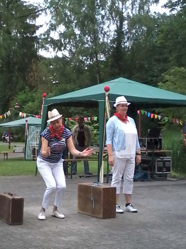 Die Lacher auf ihrer Seite hatten Heimleiterin Yvonne Sonnenfroh und Pflegedienstleiterin Karin Schröter mit ihrer Interpretation des Welthits „Zwei kleine Italiener“ aus dem Jahr 1962, im Original gesungen von Conny Froboess. Mit alten Holz- und Lederkoffern und dem typisch italienischen Outfit aus weißer Hose, blauem Streifenshirt und „Mafiahut“ konnte jeder der Besucher die Sehnsucht der Beiden nach der Heimat nachempfinden, zumal nach dem aufregenden Elfmeterschießen Der Fussball-EM am Vorabend!
