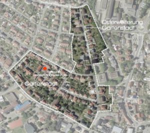 Die Stadt Sinsheim möchte ihre Bürger in den Prozess der Aufstellung der Erhaltungssatzung „Gartenstadt / Osterweiterung Gartenstadt“ einbinden und lädt Eigentümer, Bewohner und interessierte Bürger zu einem Bürgerspaziergang in der Gartenstadt ein. Treffpunkt ist am Freitag, den 03.11.2017, 16.00 Uhr am Heinrich-Hagmeier-Platz (roter Punkt auf dem Foto) und ab 18.00 Uhr im Rathaus, 1. Obergeschoss, Zimmer 120 (Casino).