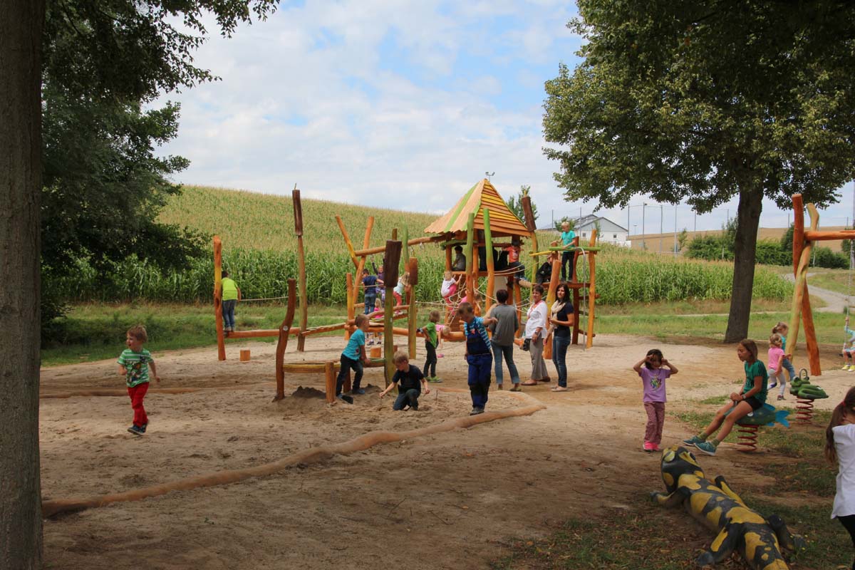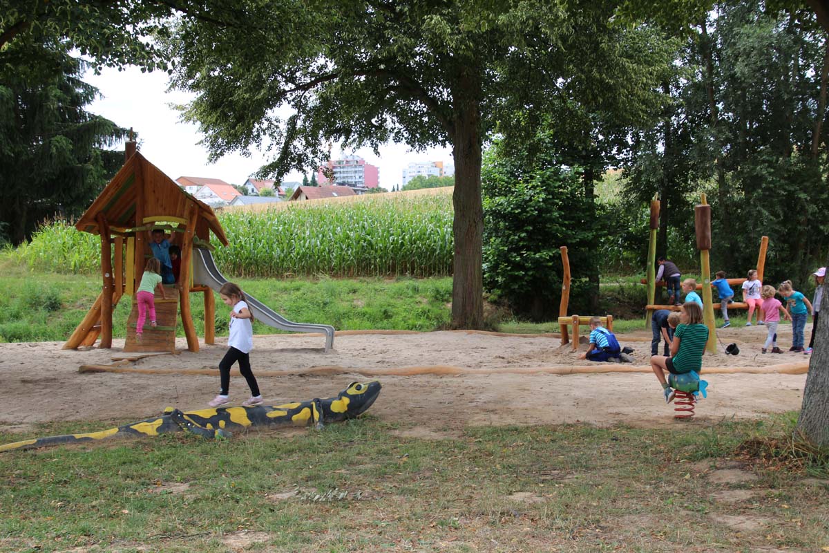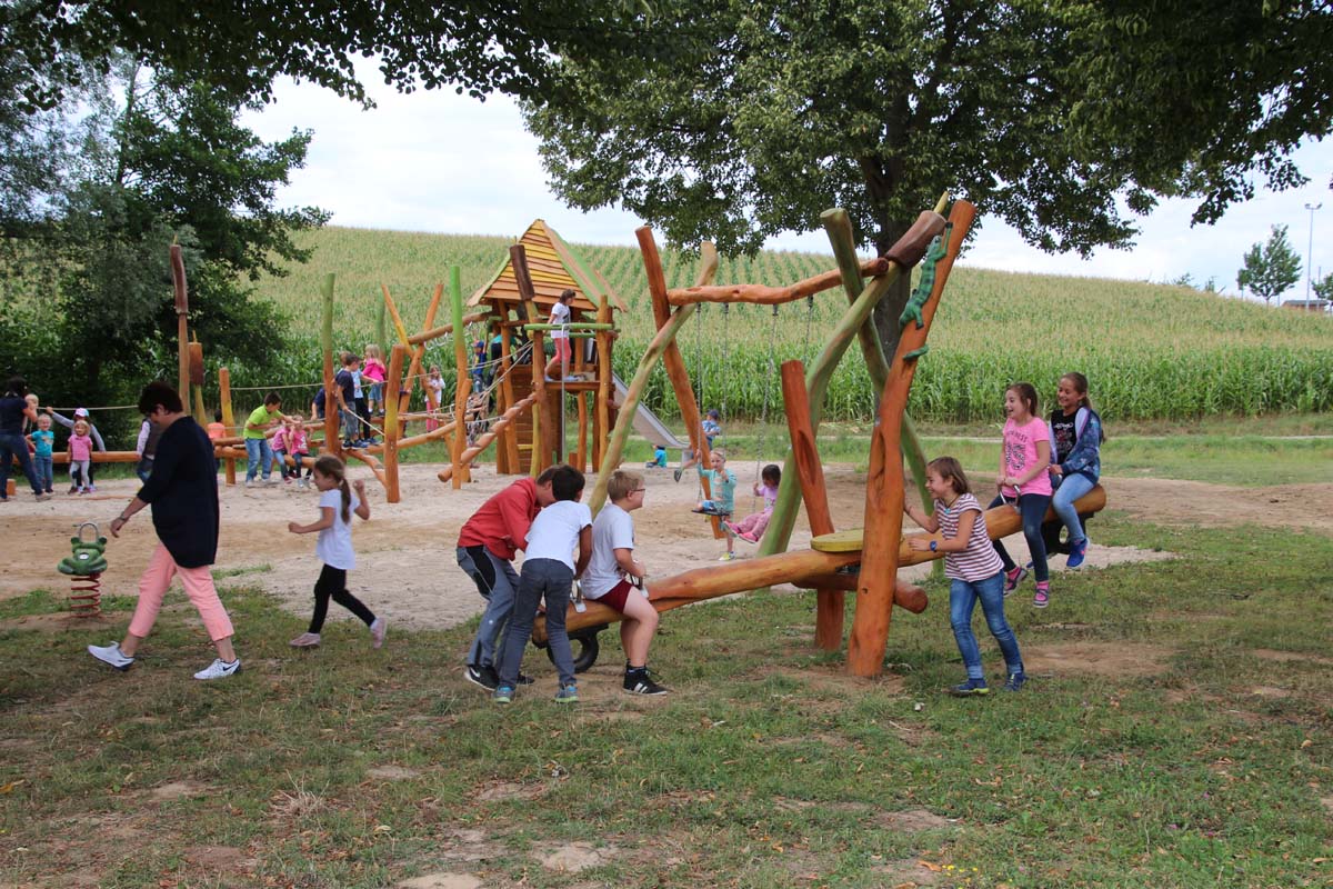 IMG_1784(zg) „Zu Plätzen bei denen Menschen leben und arbeiten gehören natürlich immer auch Spielplätze und Erholungsflächen, deshalb war es für uns von Anfang an klar, dass im neuen Baugebiet „Alter Sportplatz“ ein Spielplatz entstehen muss“, so Oberbürgermeister Jörg Albrecht bei der Einweihung des Spielplatzes in Rohrbach. Der neu gestaltete Spielplatz fügt sich in den bestehenden Baumbestand ein und nimmt als Themenschwerpunkt den Rohrbach. So finden sich Einzelgeräte, aber auch an den Großgeräten immer wieder Ornament, mit Bezug zum Bach. Feuersalamander, Frosch und Fisch wurden an den Geräten herausgearbeitet. Auch die Rohrkolben, die im Wappen von Rohrbach vorhanden sind, finden sich in der Spielanlage wieder.