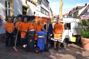 (zg) Jan Walter und Helmut Fübrich verstärken seit Anfang August den Trupp der städtischen Stadtreinigung. Insbesondere im Bereich der Innenstadt sind die beiden mit Besen, Schaufel und Kehrwagen unterwegs. „Wilder Müll wird immer mehr zum Problem, daher haben wir jetzt in diesem Bereich unser Personal verstärkt“, so Oberbürgermeister Jörg Albrecht. „Insbesondere die Recherchen und Nachverfolgungen werden engmaschiger und zur Anzeige gebracht.“ Das Team der Stadtreinigung umfasst Jürgen Nerpel und Günther Kaiser, die mit dem Piaggio-Müllwagen unterwegs sind und unter anderem die Mülleimer im Stadtgebiet leeren oder den wilden Müll einsammeln. „Wilder Müll ist an den undenkbarsten Stellen zu finden, beispielsweise wird mitten auf dem Feldweg, hinter Trafohäuschen oder in Parkhäusern usw. Müll abgelagert. Sobald wir den wilden Müll feststellen wird erst einmal recherchiert. Den einen oder anderen Müllsünder konnten wir schon ausfindig machen“, so Jürgen Nerpel. Oberbürgermeister Jörg Albrecht ergänzt, ich verstehe nicht, wie man Sperrmüll durch den halben Ort fährt und irgendwo illegal hinstellt, obwohl dieser von der AVR vor der Haustüre kostenlos abgeholt wird. In der Woche fallen ca. 1-2 Tonnen Müll im ganzen Stadtgebiet an. Das Team der Stadtreinigung wird vervollständigt durch Uwe Härter, der die Kehrmaschine fährt und die Straßenränder oder verunreinigte Plätze beispielsweise nach den Festen, reinigt.