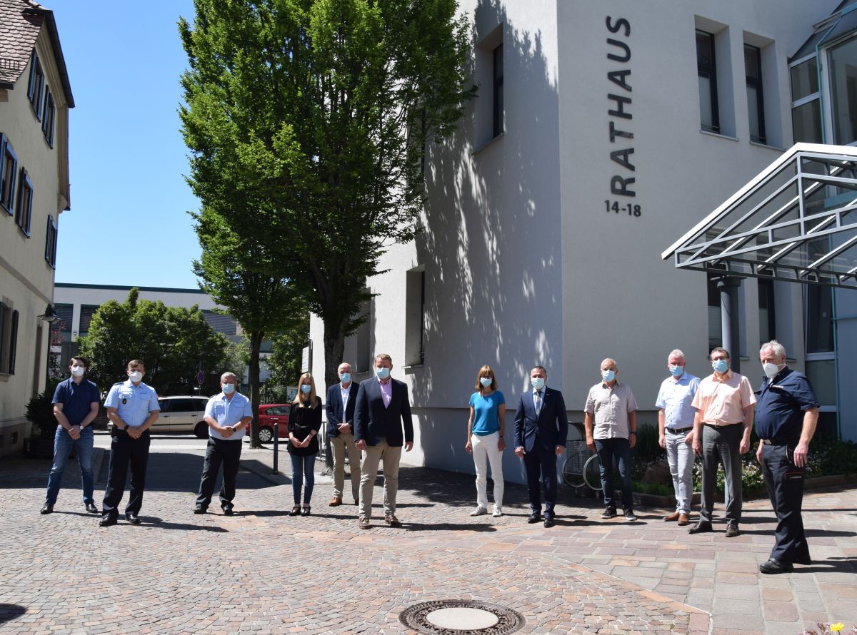 Bild (Stadt Sinsheim): Die Mitglieder des Krisenstabs v.l.n.r.: Michael Bähr (Fachkraft für Arbeitssicherheit), Polizeirevierleiter Adrian Harz, stellvertretender Revierleiter Thorsten Pisot-Schuh, Melanie Wricke (Presse- und Öffentlichkeitsarbeit), Chefarzt Dr. Johannes Berentelg (GRN), Klinikleiter Thorsten Großstück (GRN), Amtsleiterin Carmen-Eckert-Leutz (Amt für Bildung, Familie und Soziales), Oberbürgermeister Jörg Albrecht, stellvertretender Pflegedienstleiter Jürgen Bloch (GRN), Amtsleiter Marco Fulgner (Hauptamt), Dezernatsleiter Ulrich Landwehr, Stadtbrandmeister Michael Hess. Nicht im Bild: Ordnungsamtsleiter Florian Zangl