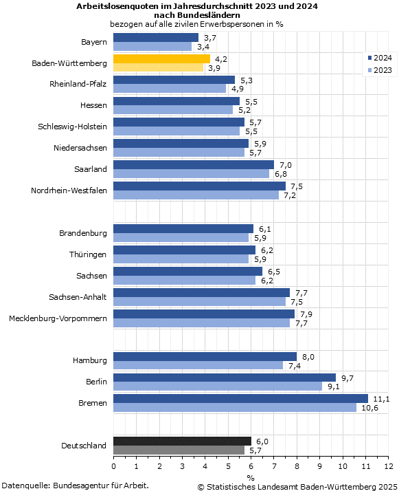 Die Arbeitslosenzahlen sind im Jahr 2024 in allen Bundesländern gestiegen. In Baden-Württemberg erhöhte sich die Zahl der Arbeitslosen im Jahresdurchschnitt um rund 24.500 Personen beziehungsweise 10 % auf 270.000. Bereits im Vorjahr war ein ähnlicher Anstieg um 22.300 Personen bzw. 10 % verzeichnet worden.