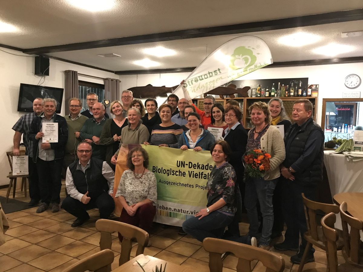 Die fertig ausgebildeten Streuobst-Pädagogen feiern Ihren Abschluss mit Bürgermeister Stefan Martus und einigen Referenten (Foto: Fröhlich)