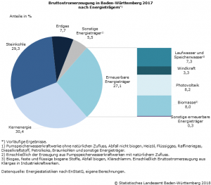 Im Jahr 2017 wurden in Baden-Württemberg rund 60 444 Millionen Kilowattstunden Strom erzeugt. Dies bedeutet einen Rückgang von 3,6 % gegenüber dem Vorjahr. Nach vorläufigen Angaben des Statistischen Landesamtes wurde der Strom zu 27,1 % aus regenerativen Energien erzeugt. Damit lag der Anteil der Erneuerbaren im Land so hoch wie noch nie. Während die Stromerzeugung aus erneuerbaren Energien ein Plus von 3,4 % verzeichnete, ging die Erzeugung aus konventionellen Energieträgern gegenüber 2016 merklich zurück (- 5,9 %).