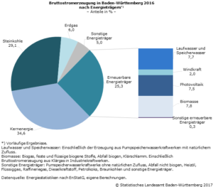 Die Beiträge der einzelnen Energieträger an der Stromerzeugung entwickelten sich gegenüber dem Vorjahr unterschiedlich. Rückgänge zeigten sich bei der Stromerzeugung aus Kernenergie und Steinkohle. So sank der Einsatz von Kernenergie zur Stromerzeugung gegenüber 2015 um 3,6 %. Mit einem Anteil an der Bruttostromerzeugung von 34,6 % blieb die Kernenergie aber weiterhin stärkster Energieträger im Strommix Baden‑Württembergs. Auch aus Steinkohle wurde im Jahr 2016 weniger Strom erzugt als noch 2015 (−6,1 %). Sie kam auf einen Anteil von 29,1 %. Die Erzeugung aus Erdgas legte hingegen deutlich zu (+9,3 %) und erreichte einen Anteil an der Bruttostromerzeugung von 6 %. Aus sonstigen konventionellen Energieträgern kamen 5 %. Dazu gehören unter anderem Heizöl, Braunkohle, Flüssiggas, Raffineriegas oder Pumpspeicherwasserkraftwerke ohne natürlichen Zufluss.