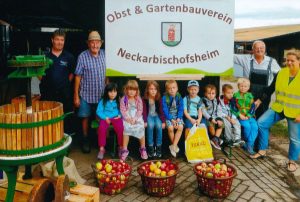 Der Obst- und Gartenbauverein hatte die Kinder des Neckarbischofsheim Kindergartens eingeladen, damit gemeinsam Süßmost hergestellt werden konnte. Doch zuvor hieß es: Äpfel zusammenlesen, Äpfel waschen, mahlen und pressen. Der frisch gepresste Saft wurde sogleich probiert und lies die Kinderaugen strahlen.