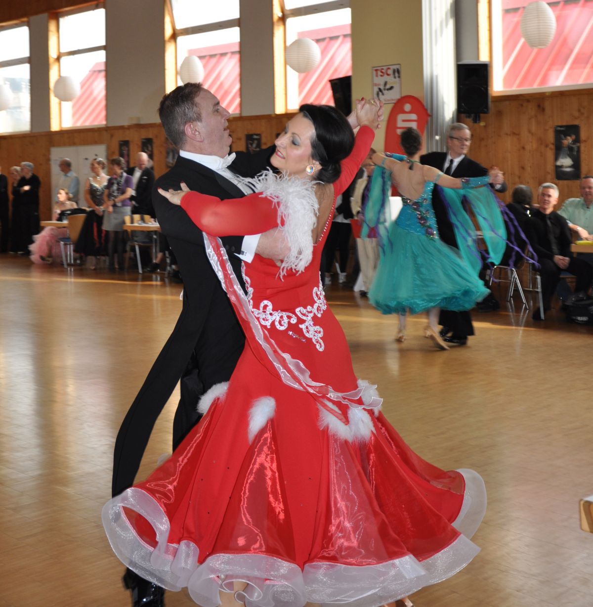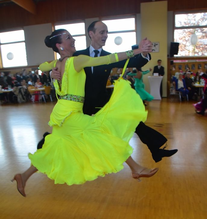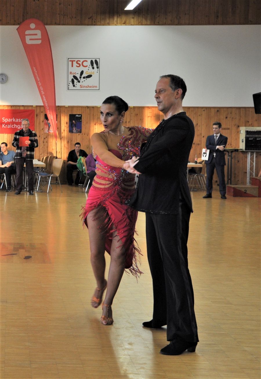Gegen 14:00 startete die höchste Leistungsklasse in dieser Altersklasse, die Senioren IIIS Klasse, in der zwei Sinsheimer Paare ihr Können zeigten. Für den TSC Rot-Gold Sinsheim gingen Marion und Markus Mäurer, die unlängst in Dubai einen tollen 3. Platz in einem internationalen Turnier erreicht hatten, an den Start. Ebenso vertraten Petra-Alexandra Leßmann und Alexander Hick, ein Spitzenpaar in dieser Leistungsklasse sowie national und international sehr erfolgreich und jüngst für sportliche Leistungen im Rahmen des Neujahrsempfangs in der neuen Dr. Sieber Halle geehrt, den TSC Rot-Gold Sinsheim. Zunächst lagen Hick/Leßmann mit beiden ersten Tänzen in Führung. Dann gewannen Michael und Regina Groß aus Besigheim die folgenden beiden Tänze.und es wurde richtig spannend. Letztlich sollte der Quickstep über den Sieg des Turniers entscheiden. Am Ende fehlte Hick/Leßmann 1 Punkt zum Sieg. Sie erreichten Platz 2 hinter dem Ehepaar Groß, ein ebenfalls sehr erfolgreiches Paar in dieser Klasse. Ehepaar Mäurer freute sich über Platz 4.