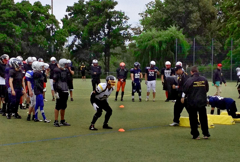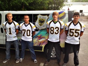Am Sonntag den 15.07.2012 reisten Siamak Petri (DE), Alexander Meider (LB), Fabian Golenia (WR) und Frietjof Rehfuss (QB) nach Fellbach zum offiziellen Tryout der Jugendlandesauswahl BaWü. Sie versuchten die Auswahlcoaches von Ihrem Können, welches Sie während Ihrer ersten Saison in der Jugendlandesliga schon gezeigt haben, zu überzeugen. Das Tryout fand von 10:00 – 18:00 statt und beinhaltete neben den allgemeinen Leistungstests(Weitsprung-, Hochsprung-, Sprint- und Aggilitätstests) auch positionsbedingte Trainingseinheiten und eine Scrimmage (Trainingsspiel). Die Auswahlcoaches begrüßten in Fellbach über 200 Jugendliche zum Tryout aus fast allen Teams BaWü’s.