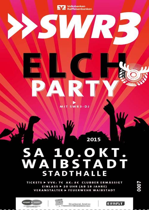 (zg) 150 Jahre Feuerwehr Waibstadt! Am 10.10.2015 steigt die große SWR3-Elchparty zusammen mit dem SWR3-DJ Josh Kochhann und dem SWR3-Elch. Tausende SWR3-Hörer, Fans und Party-Begeisterte feiern jedes Jahr mit SWR3 lange und heiße Nächte im gesamten Sendegebiet. Los geht es um 20.00 Uhr in der Stadthalle Waibstadt. Der Kartenvorverkauf hierzu hat begonnen, Tickets gibt es in den Waibstadter Filialen der Volksbank Neckartal und Sparkasse Kraichgau sowie direkt bei der Feuerwehr Waibstadt. Möglich ist auch der Onlinekauf unter http://tickets.feuerwehr-waibstadt.de ; Karten gibt es an der Abendkasse zu acht Euro,SWR3-Clubber erhalten eine Ermäßigung von einem Euro