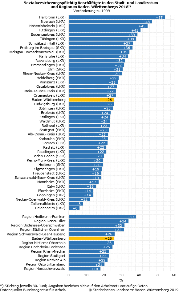 In den letzten 20 Jahren war flächendeckend in allen Regionen und Kreisen Baden-Württembergs ein mehr oder weniger starker Zuwachs der sozialversicherungspflichtig Beschäftigten zu beobachten. In den 12 Regionen des Landes reichten die prozentualen Zuwachsraten von 39 % in der Region Heilbronn-Franken bis 18 % in der Region Nordschwarzwald. In den 44 Stadt- und Landkreisen war die Spannweite mit einem Zuwachs um 55 % im Landkreis Heilbronn bis 6 % im Landkreis Heidenheim spürbar größer. Alle Regionen sowie 43 der 44 Stadt- und Landkreise erreichten 2018 Höchststände bei der Zahl der sozialversicherungspflichtigen Arbeitsplätze. Einzig der Stadtkreis Baden-Baden zählte im Jahr 2012 noch etwas mehr Beschäftigte als 2018.