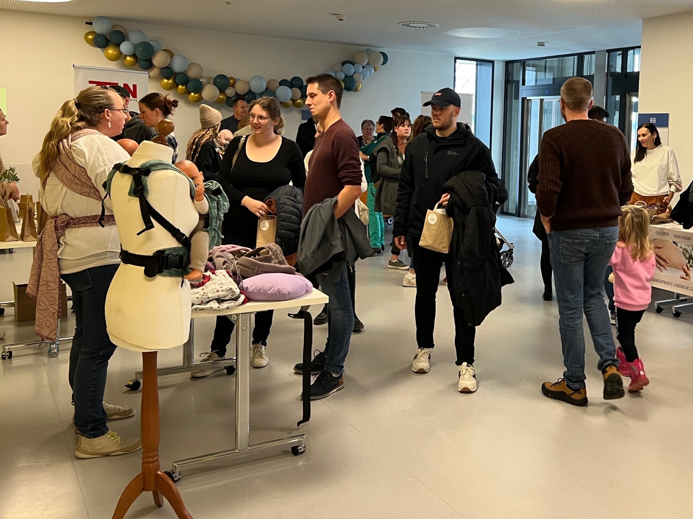 Im Foyer führte Trage-Beraterin Christina vor, welche unterschiedlichen Arten des Tragens es gibt und Corinna Bauder, freie Referentin von der Landes-Initiative BeKi (Bewusste Kinderernährung), informierte leidenschaftlich über Essen und Trinken im ersten Lebensjahr und über das kostenfreie Online-Angebot mit dem Titel „Vom Brei zum Brot – so gelingt der Übergang zum Familienessen.“ Bei Jana Kolb erfuhren die Schwangeren viel Wissenswertes über „Hypnobirthing“ und „peripartale Hypnose“. Dabei geht es um vorab erlernte Entspannungstechniken, die die Geburtsschmerzen reduzieren können. Auch das „Zentrum Erste Hilfe Notfalltraining (ZEHN) – Erste Hilfe am Baby und Kind“ informierte vor Ort über die Wichtigkeit, einen Erste-Hilfe-Kurs zu besuchen.