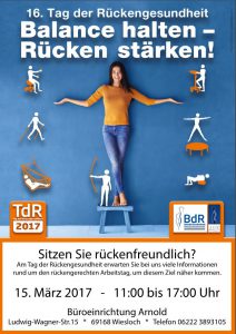 Unter dem Motto „Balance halten – Rücken stärken!“ findet am 15. März 2017 bundesweit der Tag der Rückengesundheit statt. Bereits zum 16. Mal organisieren die Aktion Gesunder Rücken (AGR) e. V. und der Bundesverband deutscher Rückenschulen (BdR) e. V. diesen Aktionstag. In ganz Deutschland wird in zahlreichen Veranstaltungen und Aktionen Information und Hilfe für einen rückenfreundlicheren Alltag geboten. Schirmherrin ist Helga Kühn-Mengel, Bundestagsabgeordnete und Präsidentin der Bundesvereinigung Prävention und Gesundheitsförderung e. V. (BVPG).