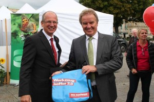 Landeshandwerkspräsident Rainer Reichhold führte den baden-württembergischen Umweltminister Franz Untersteller durch das Informationszelt des Handwerks und erläuterte: „Das Handwerk ist der Motor der Energiewende schlechthin. Es gibt fast keinen Bereich, der nicht auf das Handwerk angewiesen ist. Diesen elementaren Beitrag zeigen wir heute auf.“