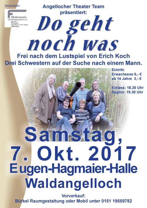 TSV Theaterabend mit dem Angellocher Theaterteam (zg) Am Samstag, den 7. Oktober 2017 um 19:30 Uhr veranstaltet der Förderverein des TSV Waldangelloch einen Theaterabend in der...