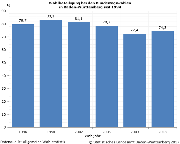 Baden‑Württemberg war 2013 das Bundesland mit der höchsten Wahlbeteiligung Am 24. September 2017 wird der 19. Bundestag gewählt. Von besonderem Interesse wird hierbei auch die...