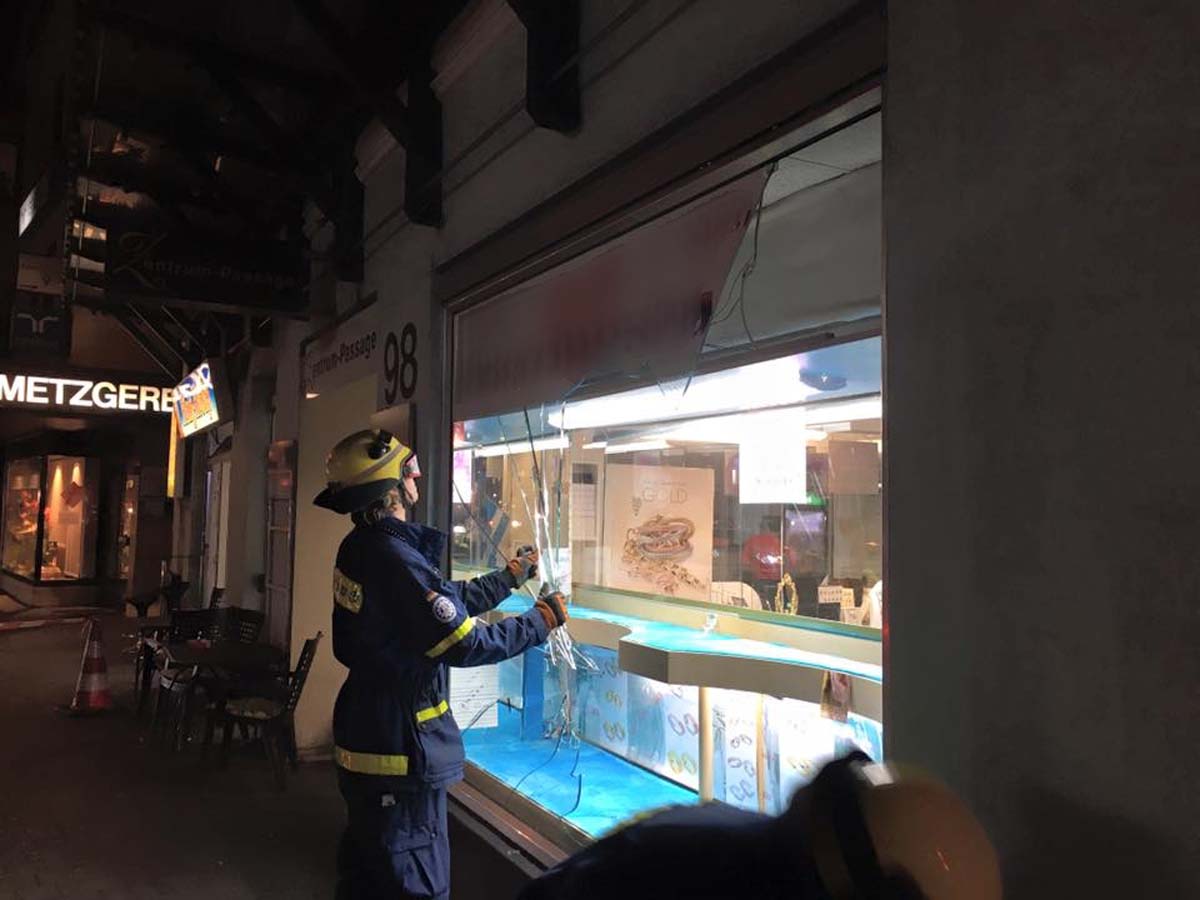 THW Sinsheim verschließt Schaufenster eines Juweliergeschäft