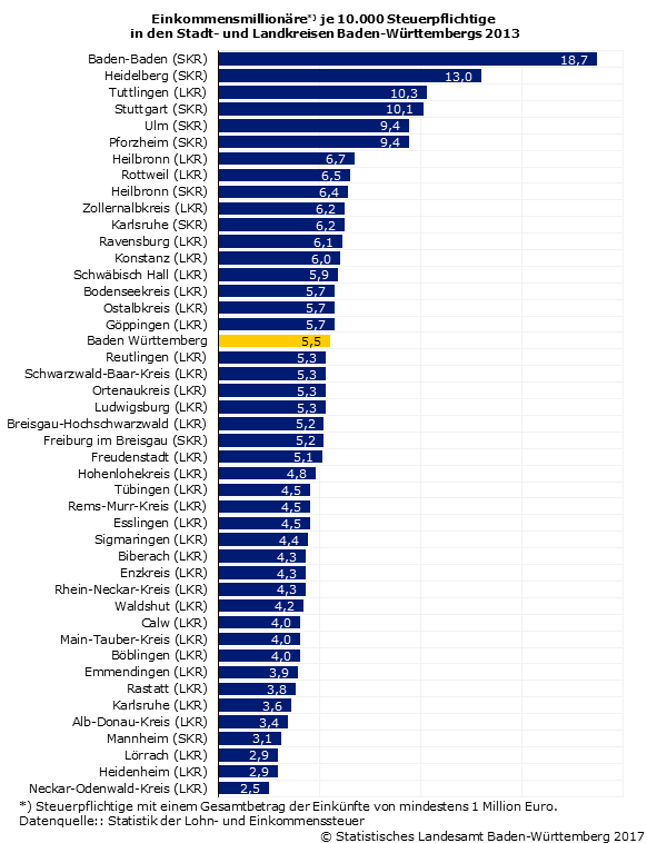 Lohn- und Einkommensteuer 2013 - »Millionärsdichte« in Baden-Baden mit Abstand am höchsten Im Jahr 2013 erzielten 2 989 Lohn- und Einkommensteuerpflichtige1 in Baden‑Württemberg...