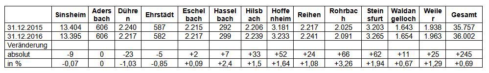 Einen leichten Zuwachs von ca. 0,80 % der Einwohnerzahlen kann die Stadt Sinsheim im letzten Jahr verzeichnen. Nach einer Fortschreibung der Kommunalen Informationsverarbeitung...