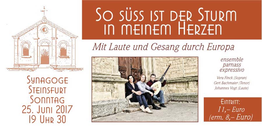 Sonntag 25. Juni 2017 um 19.30 Uhr, Alte Synagoge Steinsfurt, Entritt: 11 € Ensemble parnass expressivo, Vera Finck (Sopran), Ger Bachmaier (Tenor), Johannes Vogt (Laute)...
