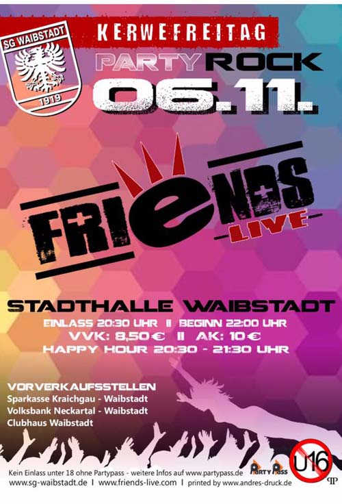 Freitag 06. November 2015 ab 20.30 Uhr in der Stadthalle WaibstadtTraditionell eröffnet die SG Waibstadt wieder die KERWE in WAIBSTADT. Dieses Jahr wird die Band "FRIENDS LIVE"...