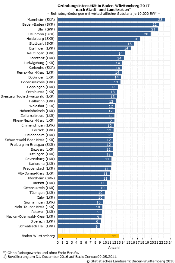 Baden-Württemberg: Höchste Gründungsintensität in den Stadtkreisen Mannheim, Baden-Baden, Ulm und Heilbronn Im Jahr 2017 wurden in Baden-Württemberg etwa 66 300 Gewerbebetriebe...