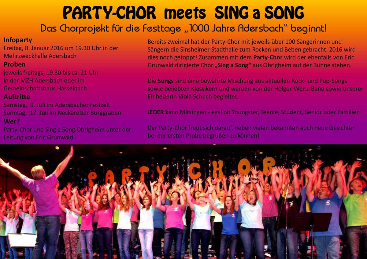(zg) Ein Highlight des Jubiläumsjahrs wirft seine Schatten voraus: PARTY-CHOR meets SING a SONG, das Chorprojekt für die Festtage „1000 Jahre Adersbach“ beginnt! Die Infoparty...